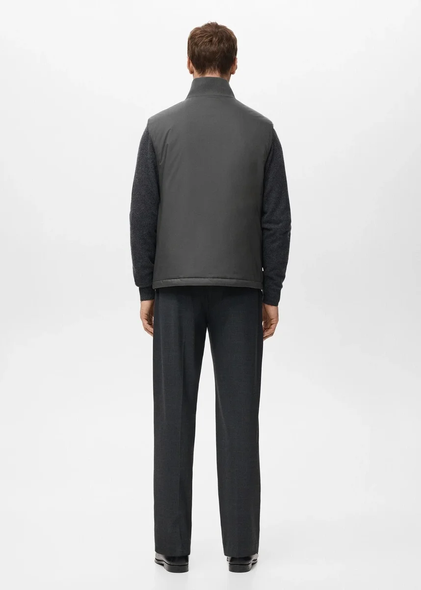 Silhouette dritta. Design trapuntato. Collo lavorato a trecce. Due tasche frontali. Tasca interna a filetto. Senza maniche. Chiusura frontale con zip.