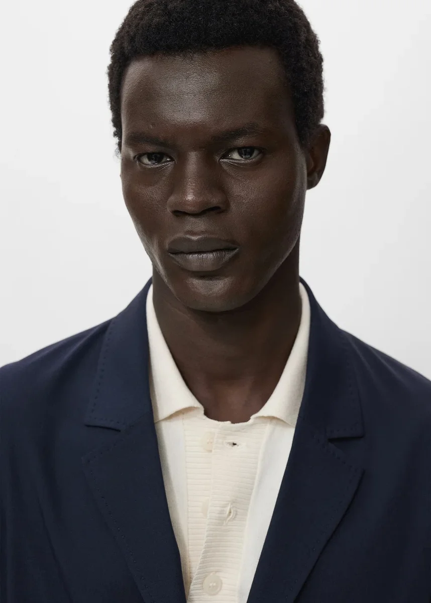 Vestibilità slim. Tessuto leggero. Dettagli con cuciture a punto indietro. Collo con revers a dente. Maniche lunghe. Due tasche applicate sul davanti. Tasca interna. Sfoderato. Chiusura frontale con bottoni. Orlo con spacchi laterali