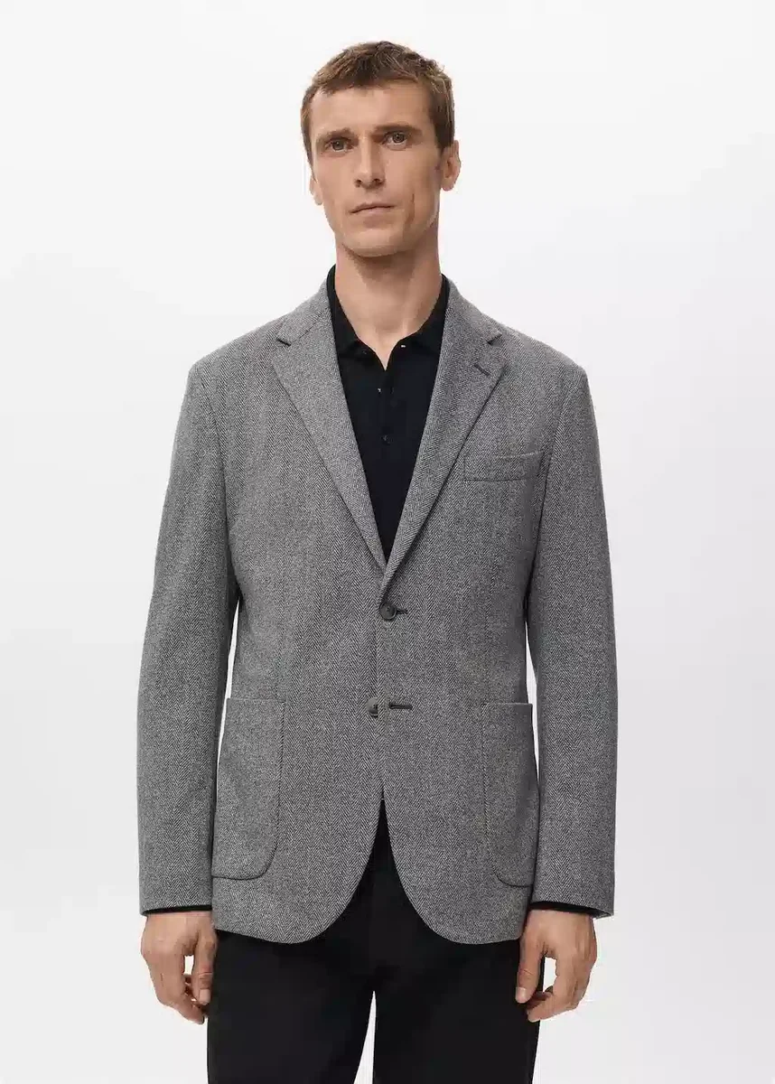Vestibilità slim. Motivo a spina di pesce. Revers classico e asola. Tasca applicata sul petto. Due tasche applicate sui fianchi. Polsini con bottoni. Doppio spacco posteriore sull’orlo. Chiusura frontale con bottoni