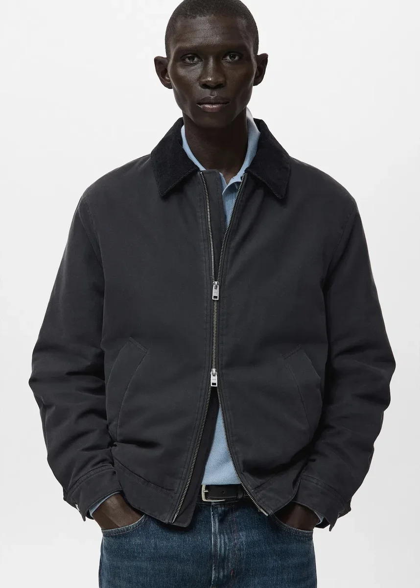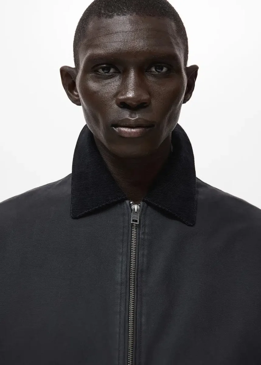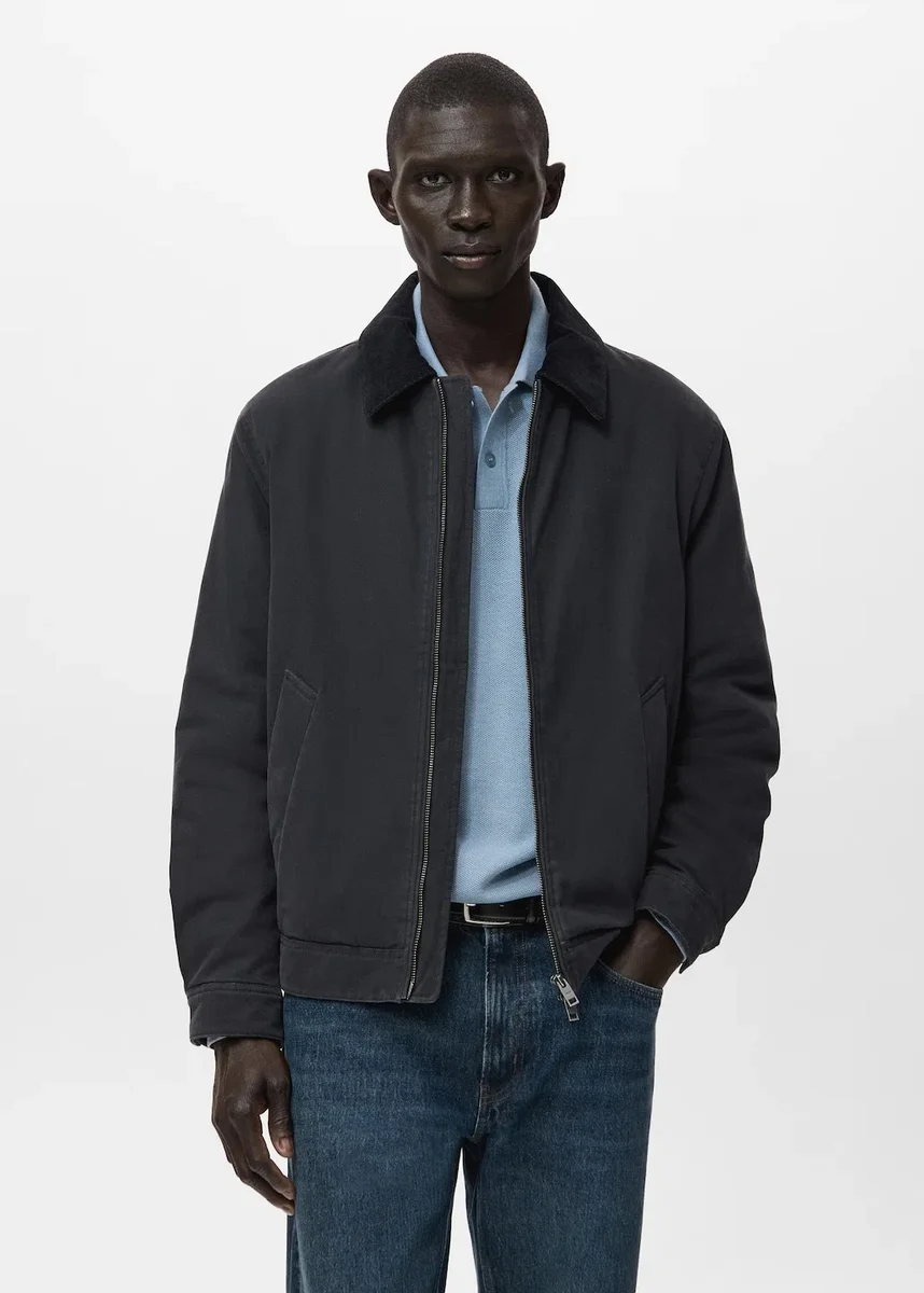 Vestibilità regolare. Tessuto denim di cotone. Design trapuntato. Colletto in velluto a coste. Due tasche laterali a filetto. Maniche lunghe con polsini abbottonati. Chiusura con zip a doppio cursore.