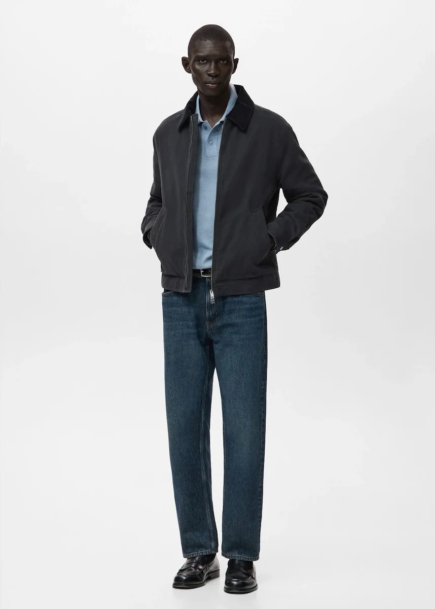 Vestibilità regolare. Tessuto denim di cotone. Design trapuntato. Collo in velluto a coste. Due tasche laterali a filetto. Maniche lunghe con polsini abbottonati. Chiusura con zip a doppio cursore
