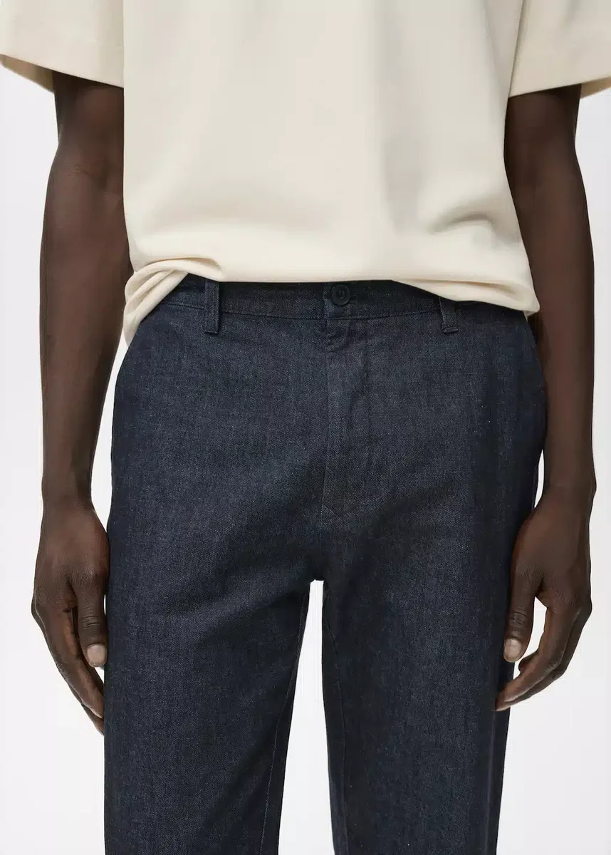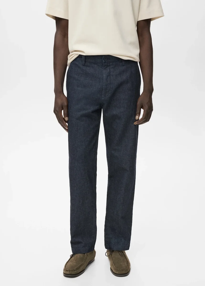Set disponibile come total look. Tessuto misto cotone e lino. Silhouette dritta. Lavaggio scuro. Passanti per cintura. Chiusura con zip e bottone. Due tasche anteriori. Due tasche con patta sul retro.