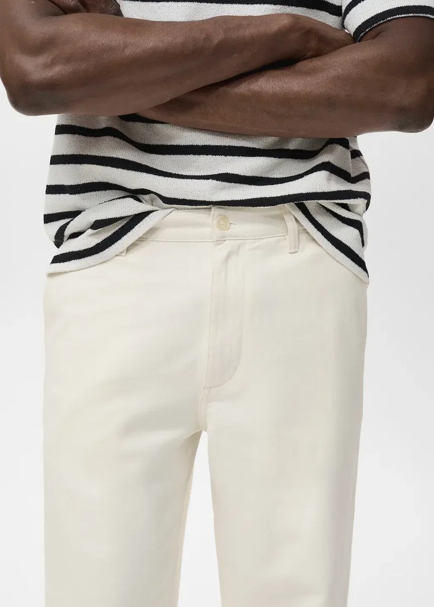 Vestibilità regolare. Tessuto misto cotone e lino. Passanti per cintura. Chiusura frontale con cerniera e bottoni. Due tasche laterali. Due tasche applicate sul retro