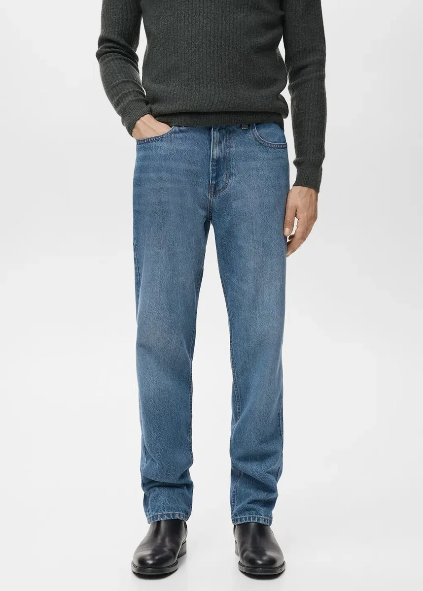 Vestibilità regolare. Tessuto denim in cotone. Lavaggio mediamente scolorito. Chiusura con zip e bottone. Passanti per cintura. Due tasche laterali. Tasca portamonete. Due tasche applicate sul retro