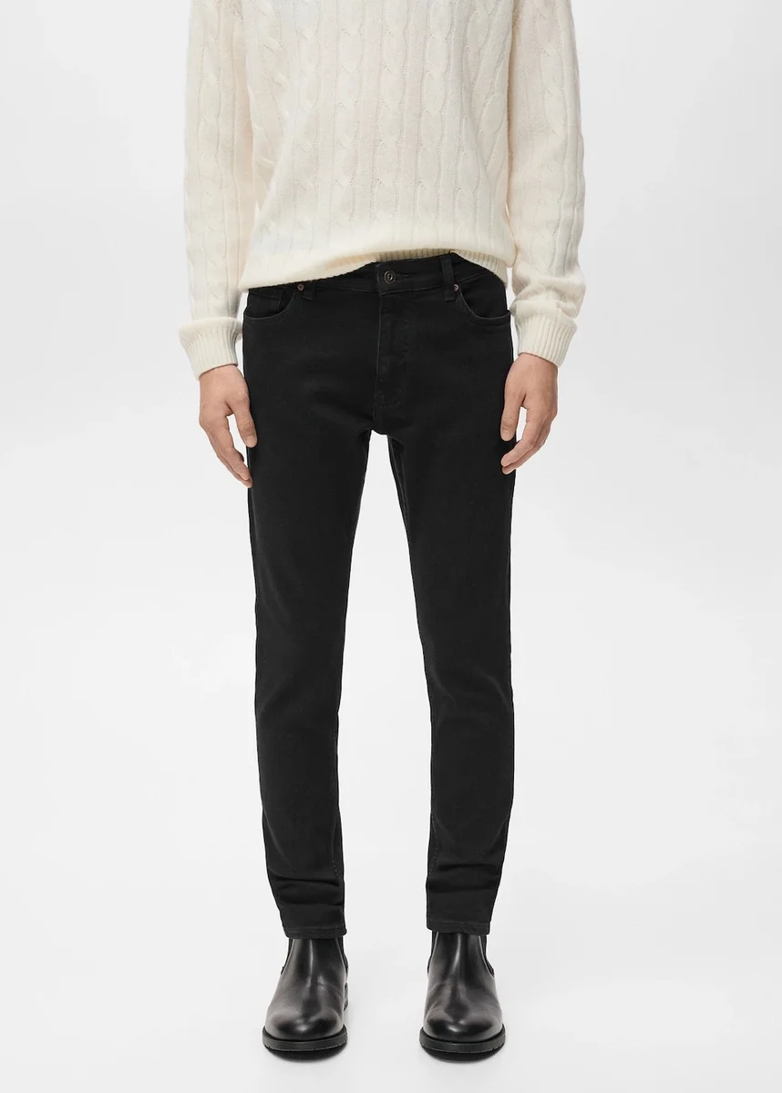Tessuto in cotone. Colore nero. Passanti per cintura. Chiusura con zip e bottone. Due tasche laterali. Tasca portamonete. Due tasche applicate sul retro. Modello jeans in denim. Vestibilità skinny: i jeans più attillati