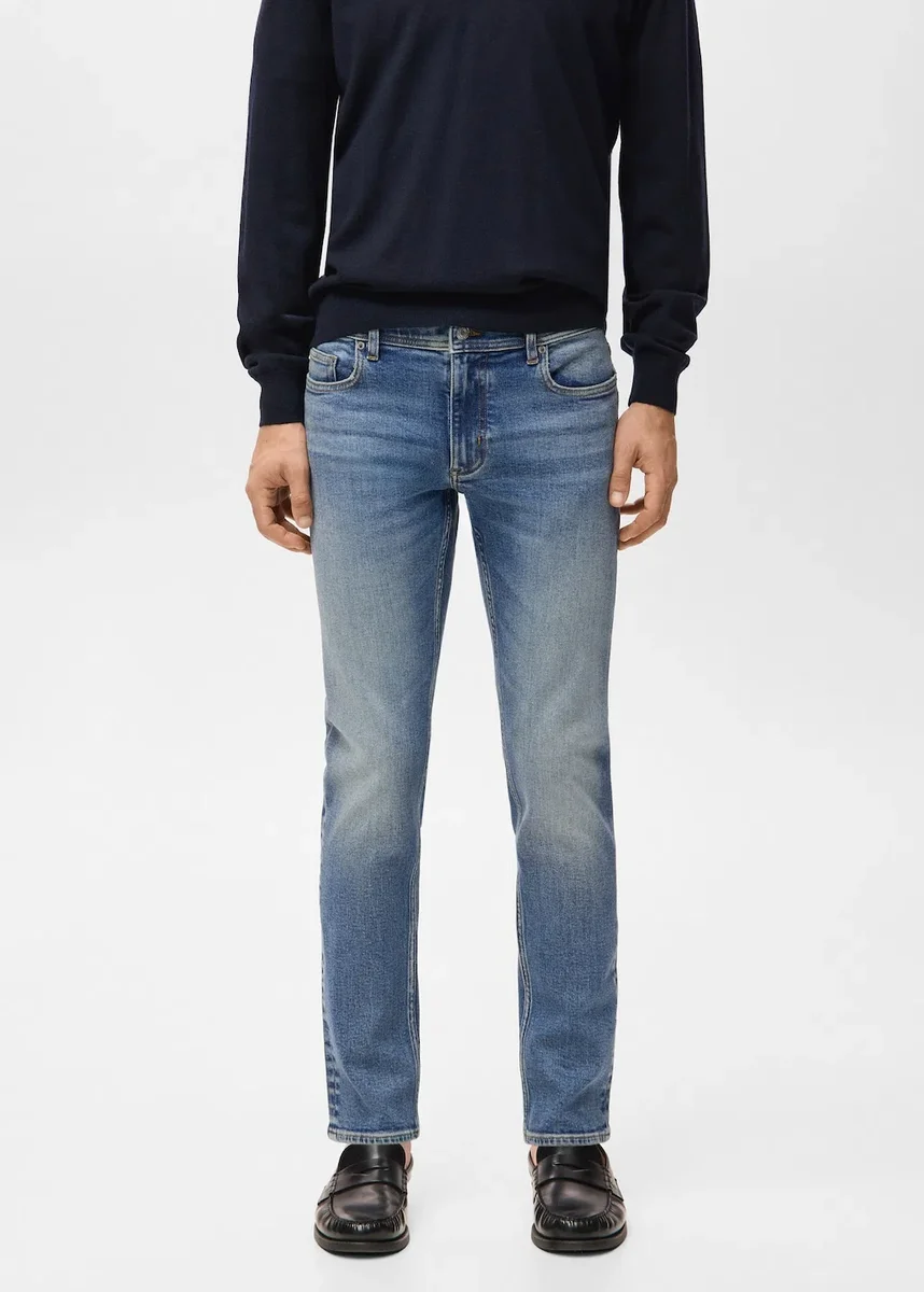 Lunghezza standard. Silhouette slim. Vita regolare. Vestibilità slim. Tessuto in cotone. Stile jeans in denim. Chiusura con bottone e cerniera. Tasche laterali. Tasca portamonete. Due tasche applicate sul retro. Lavaggio scuro slavato. Tessuto denim in cotone. Passanti per cintura. Cinque tasche. Due tasche anteriori a filetto