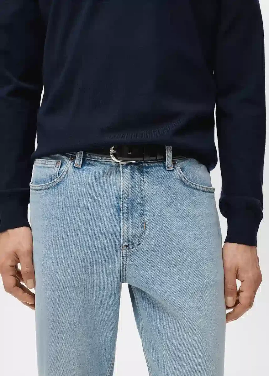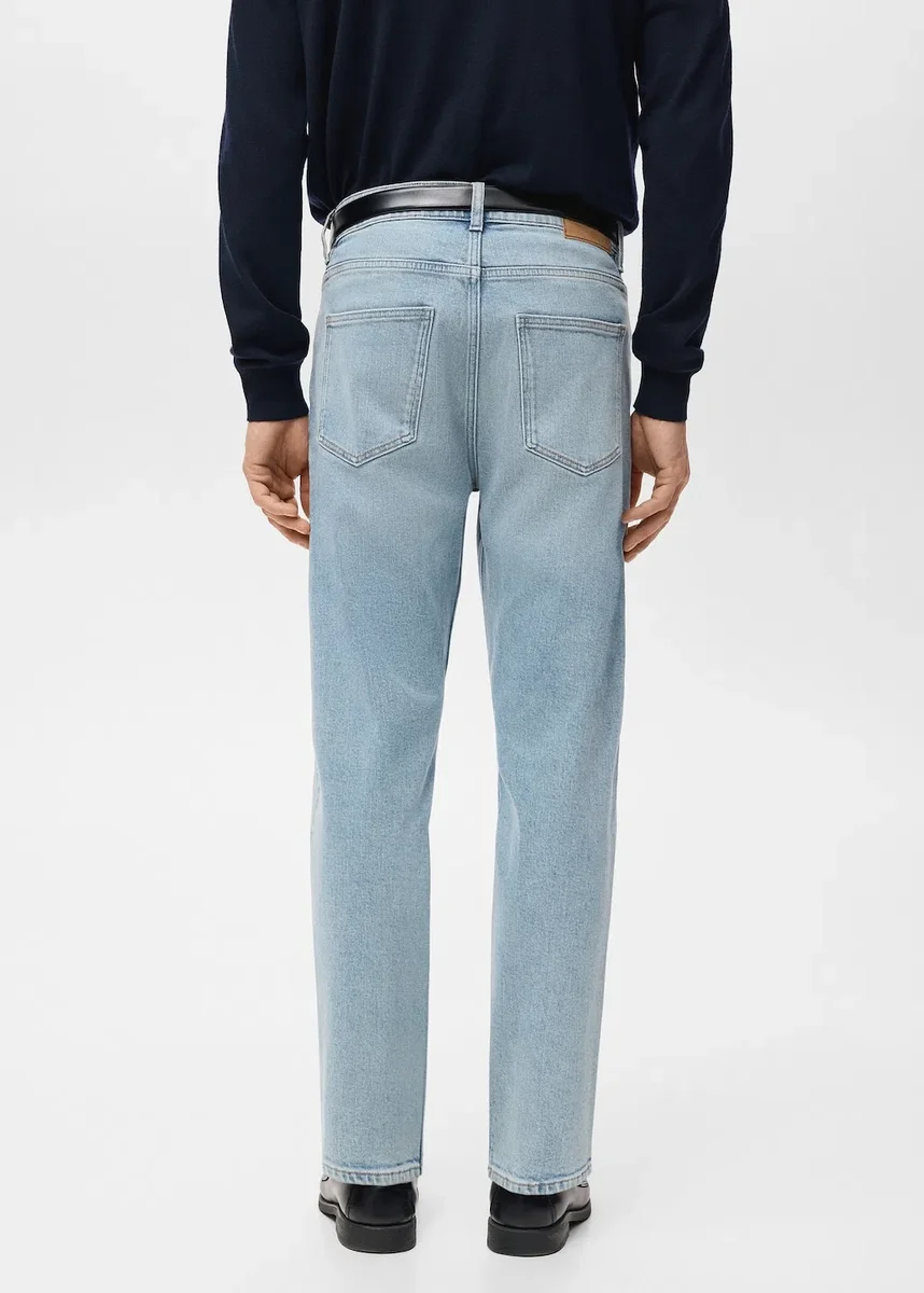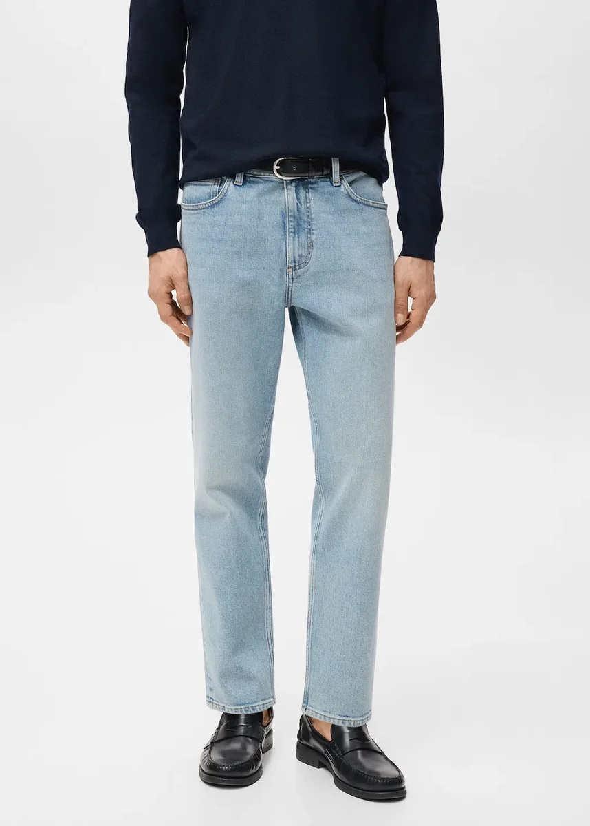 Vestibilità affusolata: taglio ampio nella parte superiore che si restringe dal ginocchio alla caviglia. Modello corto. Tessuto denim in cotone. Lavaggio chiaro. Passanti per cintura. Chiusura con zip e bottone. Due tasche laterali. Tasca portamonete. Due tasche applicate sul retro.
