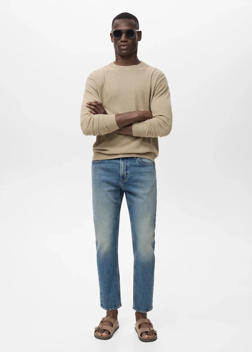 Vestibilità affusolata: taglio ampio nella parte superiore che si restringe dal ginocchio alla caviglia. Design corto. Tessuto in cotone. Stile jeans denim. Lavaggio mediamente scolorito. Passanti per cintura. Chiusura con zip e bottone. Due tasche laterali. Tasca portamonete. Due tasche applicate sul retro. Tessuto in cotone. Lavaggio leggermente scolorito.
