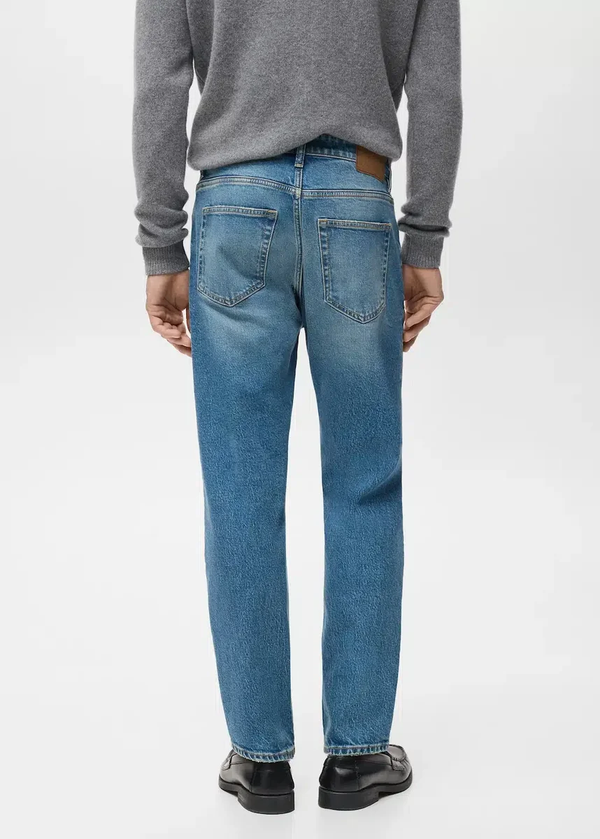 Vestibilità affusolata: taglio ampio nella parte superiore che si restringe dal ginocchio alla caviglia. Modello corto. Tessuto in cotone. Stile jeans in denim. Lavaggio medio. Passanti per cintura. Chiusura con zip e bottone. Due tasche laterali. Tasca portamonete. Due tasche applicate sul retro. Tessuto in cotone. Passanti per cintura. Vestibilità affusolata