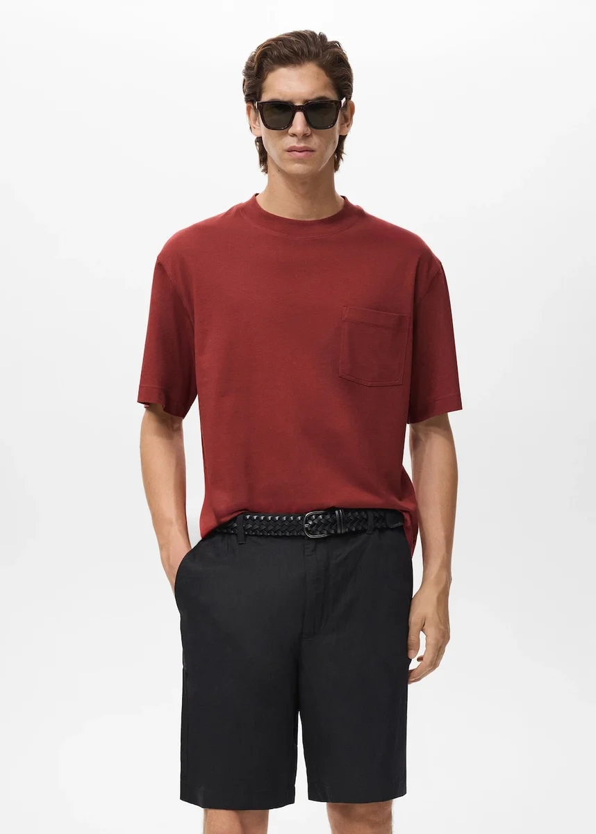 Tessuto 100% cotone. Vestibilità boxy. Collo rotondo con finitura a costine. Maniche corte. Tasca applicata sul petto. Orlo dritto.