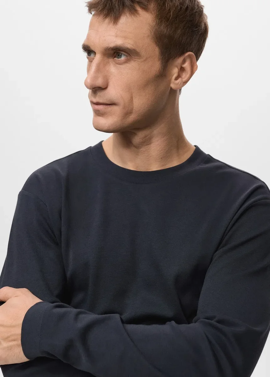 Tessuto 100% cotone. Vestibilità regolare. Girocollo. Collo e polsini a costine. Maniche lunghe. Orlo dritto.