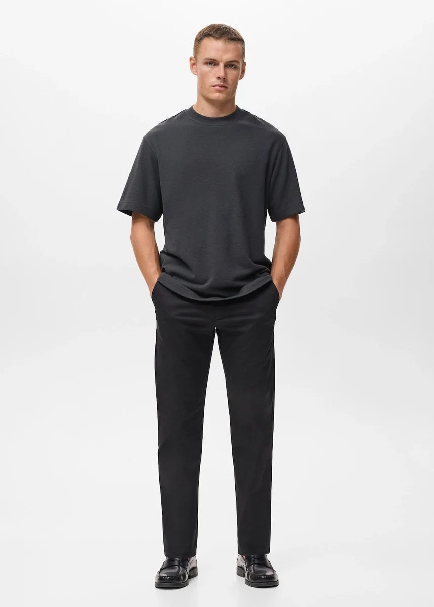 Vestibilità comoda. 100% cotone. Tessuto con microstruttura. Girocollo. Maniche corte. Collo, maniche e orlo a costine. Orlo dritto.
