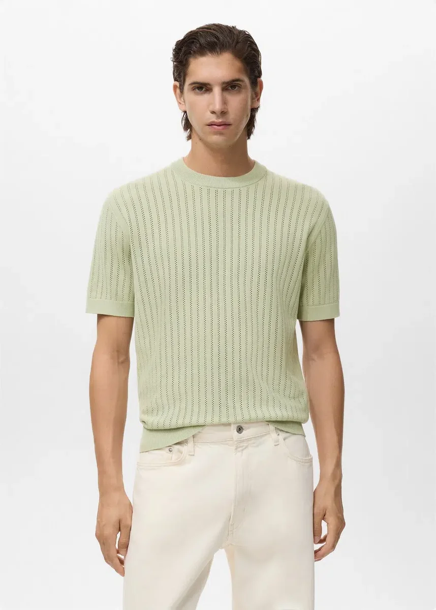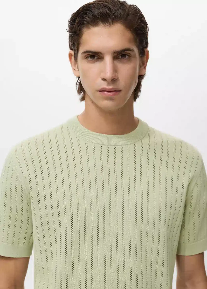 Realizzato in tessuto 100% cotone, questo capo presenta una vestibilità regolare e un design a maglia fine con lavorazione a righe traforate. Lo scollo, le maniche e l’orlo sono rifiniti con un bordo a costine. Il modello è alto 190 cm e indossa una taglia M