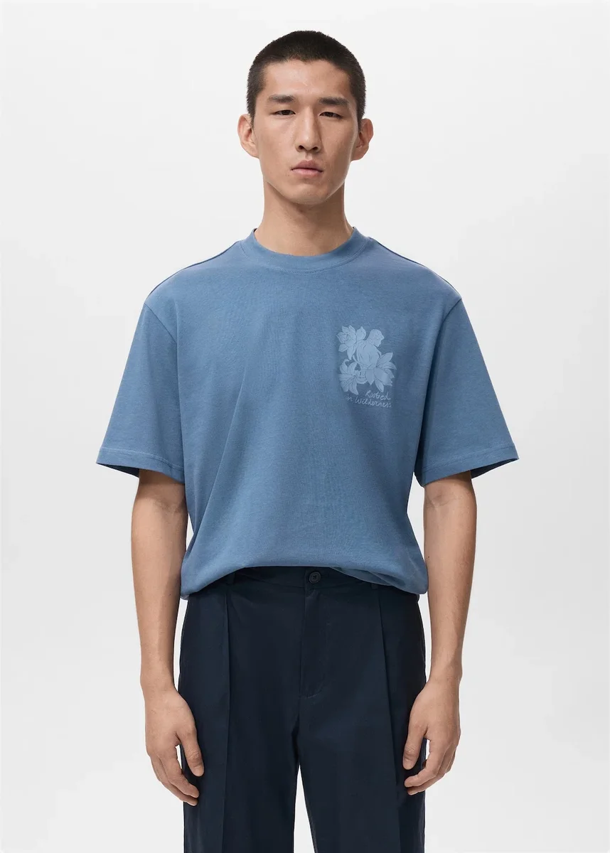 Vestibilità comoda. Tessuto 100% cotone. Disegno stampato sul petto. Girocollo. Maniche corte. Orlo dritto