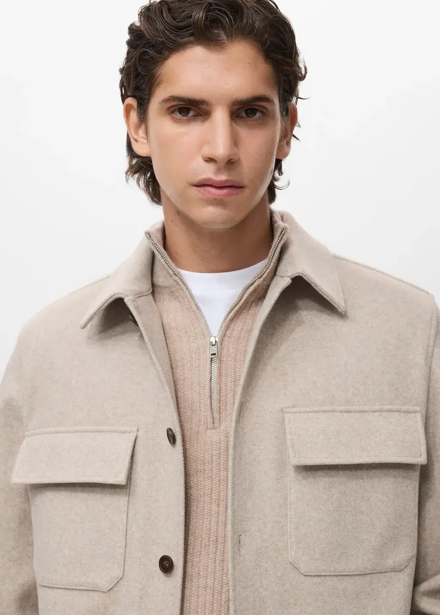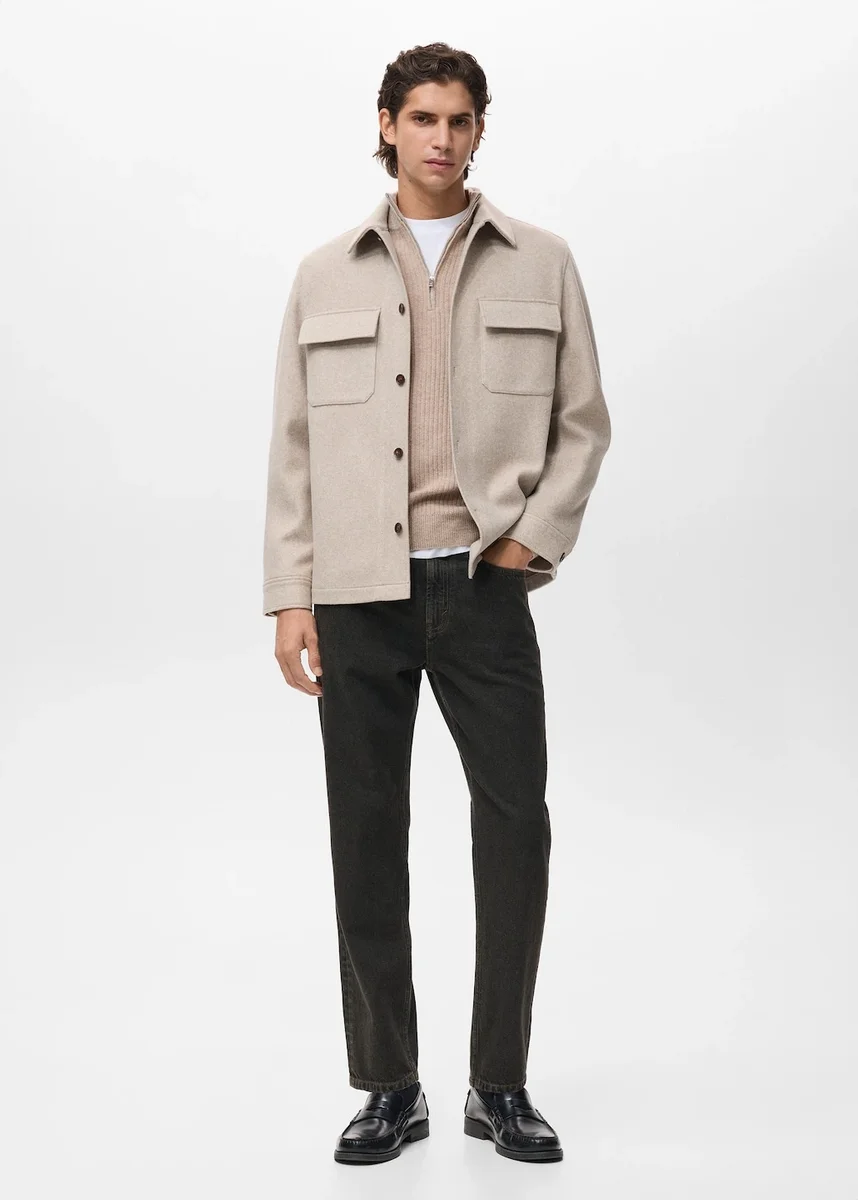 Modello dritto. Collo camicia. Due tasche sul petto con patta. Chiusura frontale con bottoni. Maniche lunghe con polsini abbottonati. Orlo arrotondato