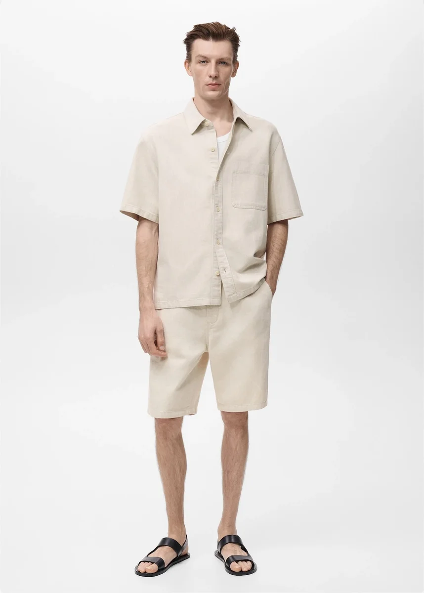 Silhouette dritta. Tessuto in cotone e lino. Passanti per cintura. Cordino regolabile. Chiusura con bottone e zip. Tasche laterali. Tasche applicate sul retro.