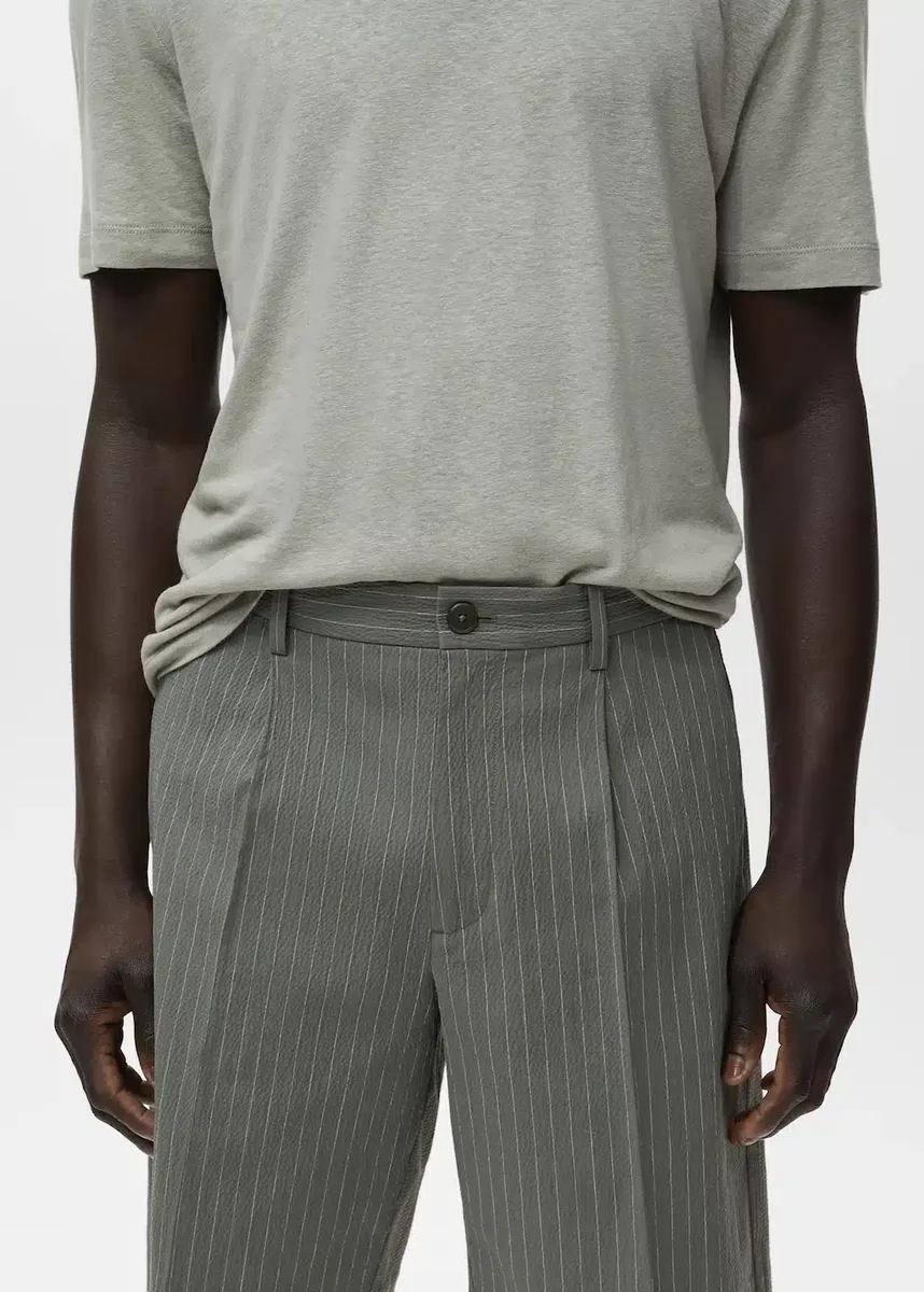 Tessuto in cotone. Modello chino. Passanti per cintura. Elastico in vita. Due tasche laterali. Tasca a filetto con bottone sul retro. Chiusura con zip e bottone