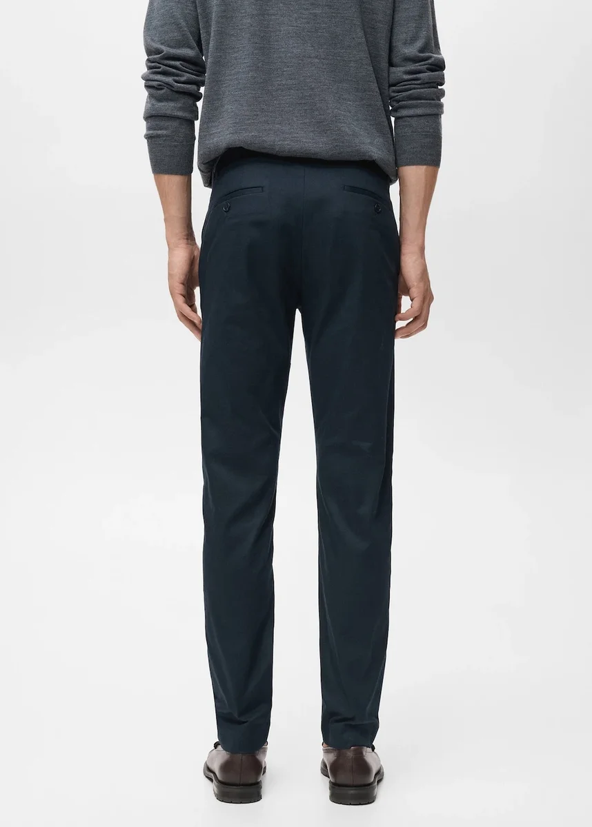Tessuto in cotone. Modello chino. Passanti per cintura. Chiusura frontale con bottoni doppiopetto e cerniera. Due tasche frontali. Quella destra include un’opzione tasca portamonete. Due tasche a filetto sul retro
