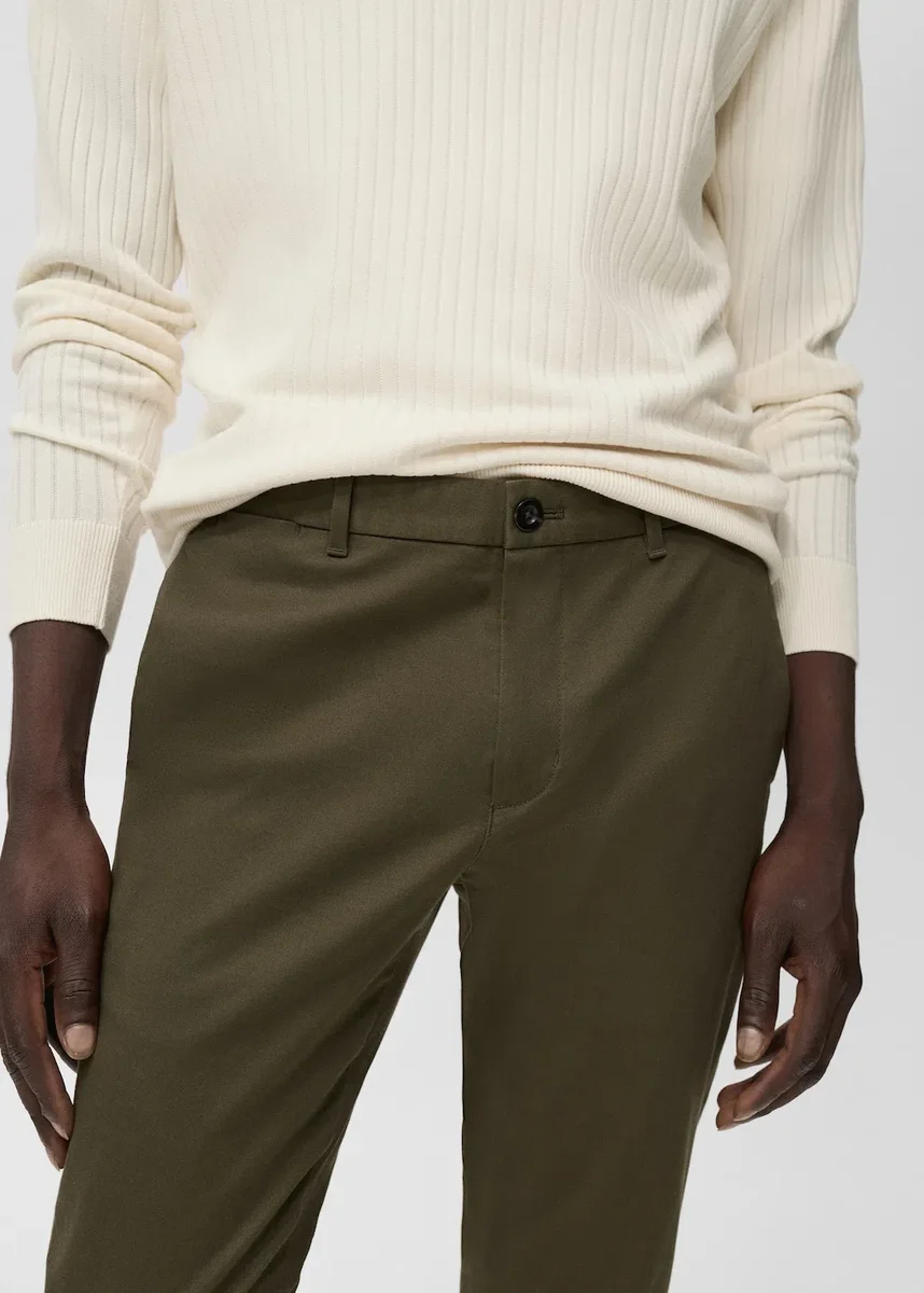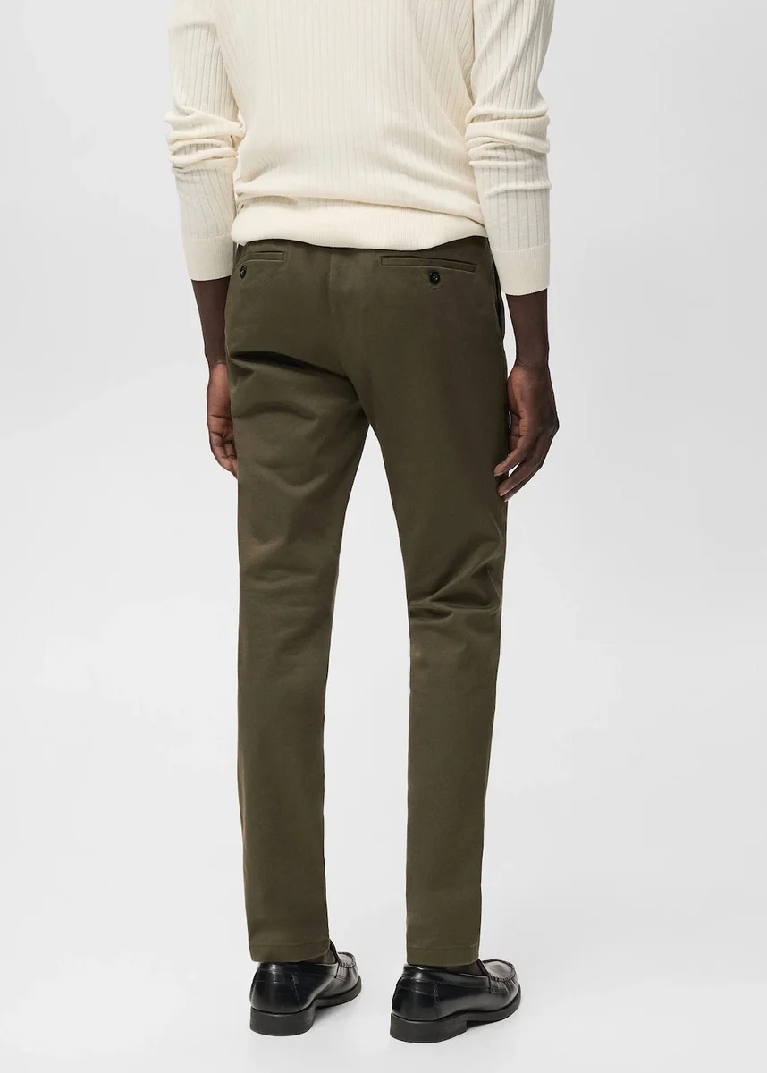 Vestibilità slim. Stile chino. Elastico in cotone. Passanti per cintura. Due tasche laterali. Tasca portamonete. Due tasche posteriori a filetto. Chiusura con zip e bottone