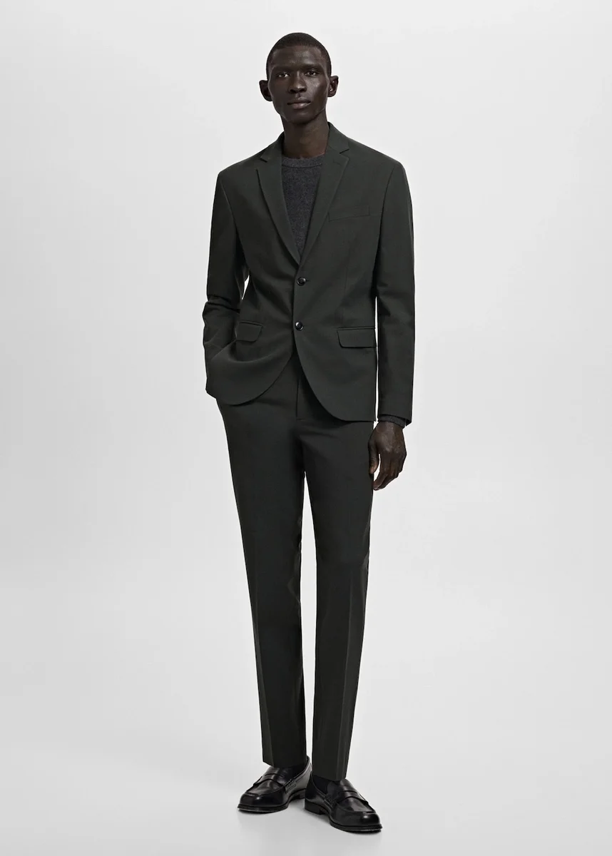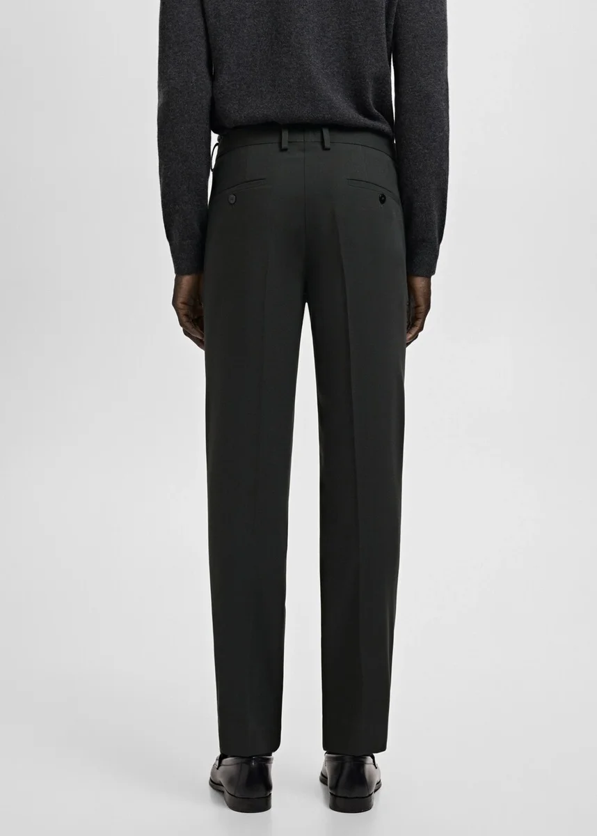 Vestibilità super slim. Tasche laterali. Due tasche a filetto con bottone sul retro. Dettaglio a strisce stirate sul davanti e sul retro. Passanti per cintura. Chiusura frontale con bottoni doppiopetto e cerniera