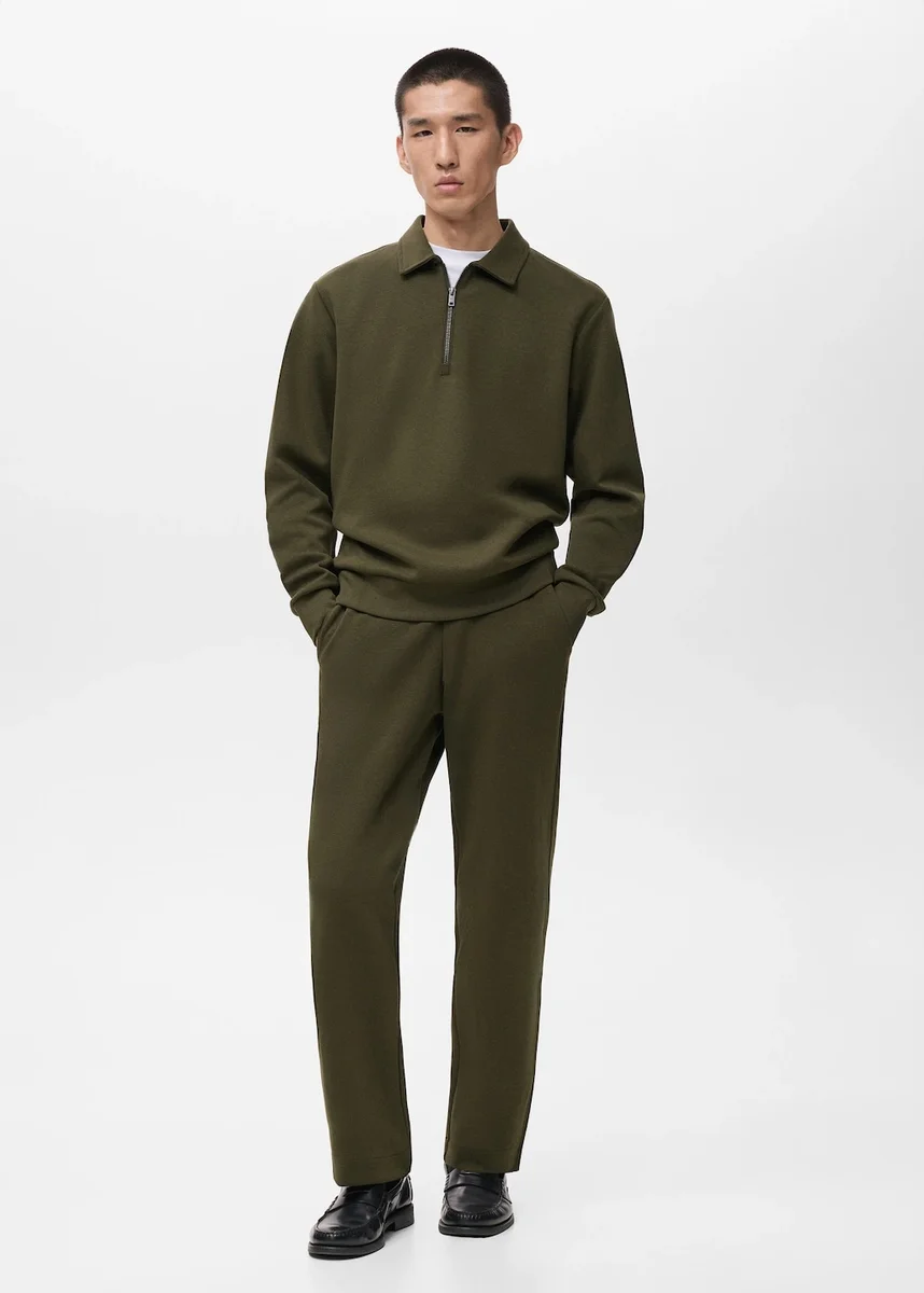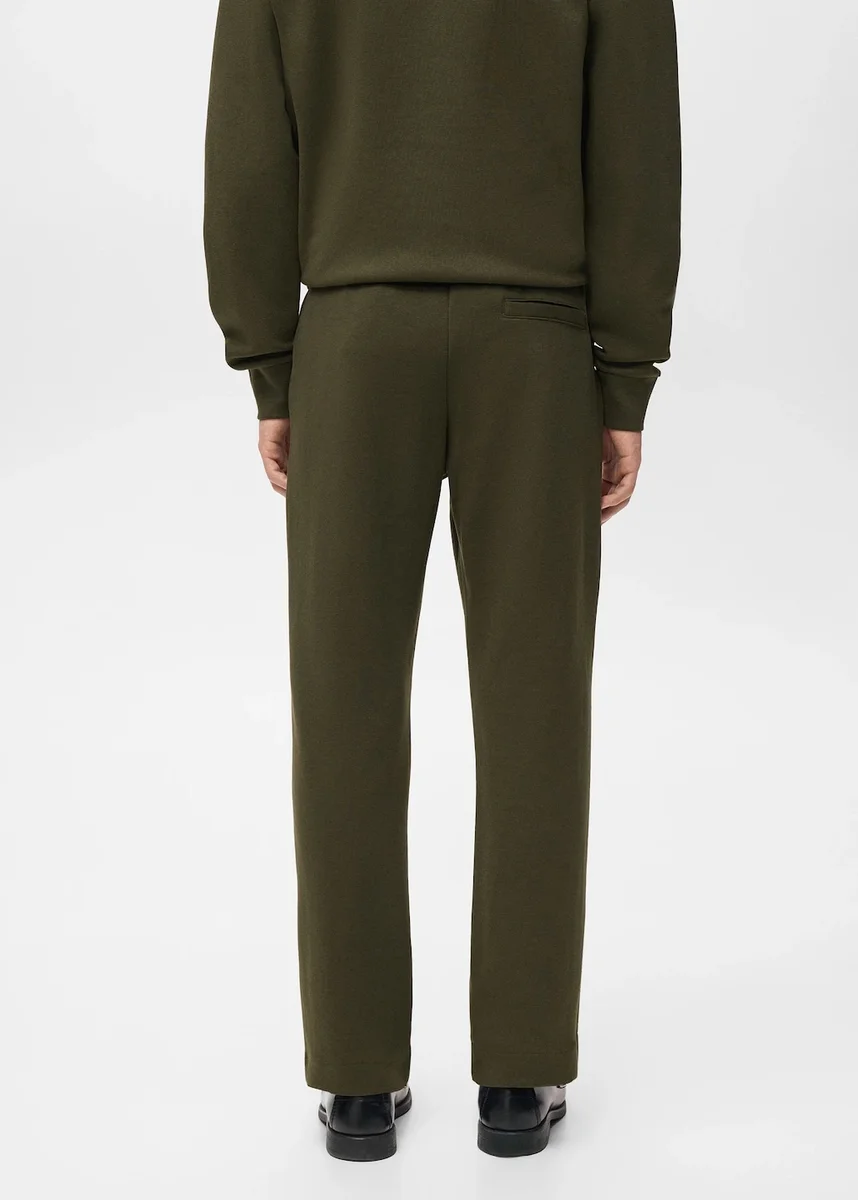 Tessuto misto cotone. Modello jogger. Silhouette dritta. Vita elasticizzata con coulisse interna regolabile. Due tasche laterali. Tasca posteriore applicata.