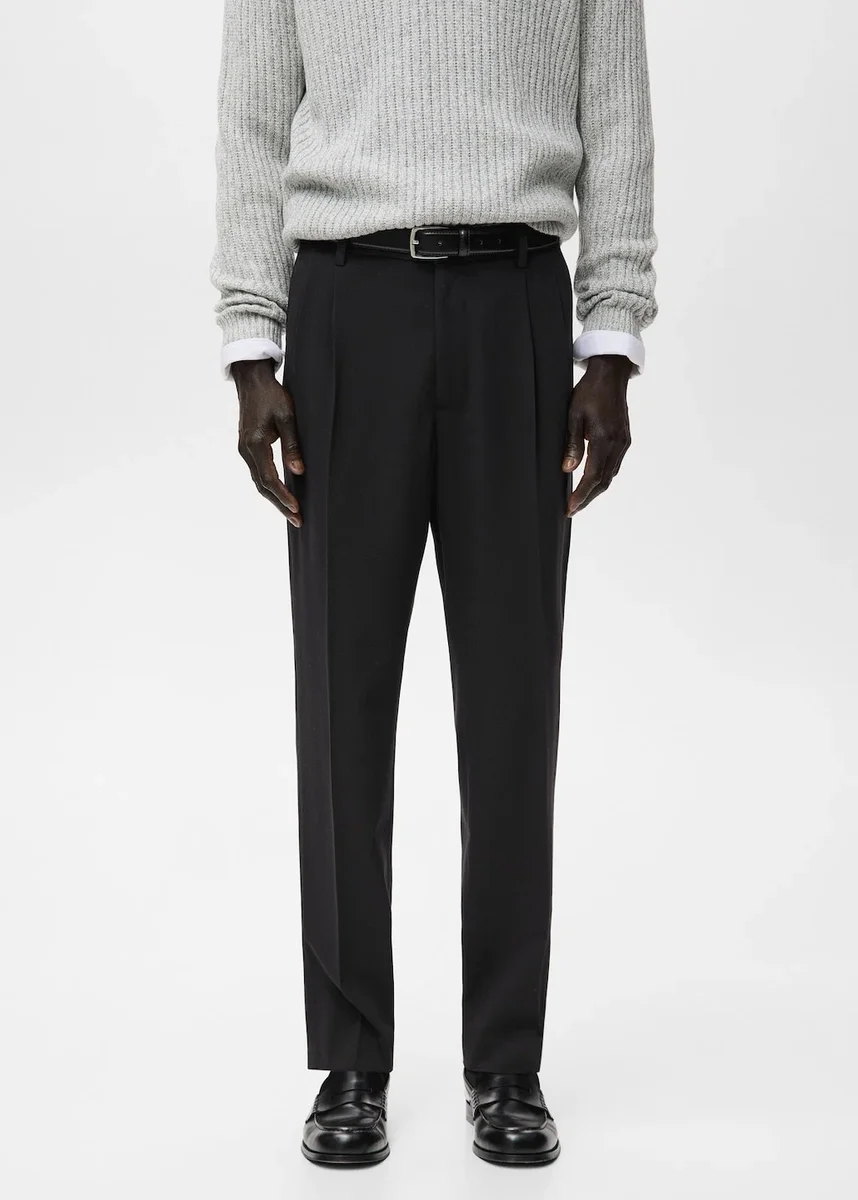 Vestibilità regolare. Pieghe frontali. Dettagli a strisce stirate sul davanti e sul retro. Due tasche laterali. Due tasche a filetto con bottone sul retro. Passanti per cintura. Chiusura frontale con cerniera e bottone.