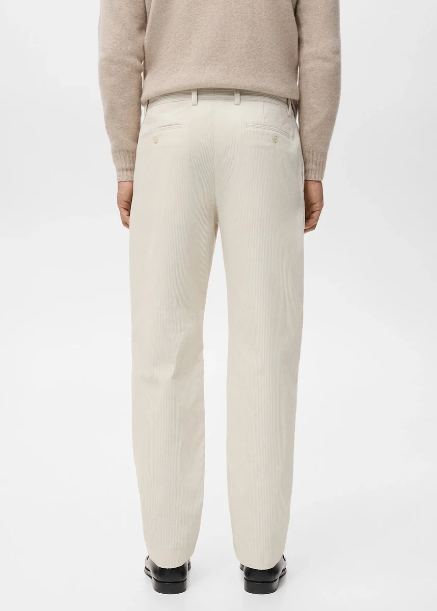 Vita media. Vestibilità regolare. Tessuto in velluto a coste. Dettaglio a righe stirate sul davanti e sul retro. Chiusura frontale con bottoni doppiopetto e cerniera. Tasca portamonete all’altezza dei fianchi. Passanti per cintura. Due tasche laterali. Due tasche a filetto con bottone sul retro