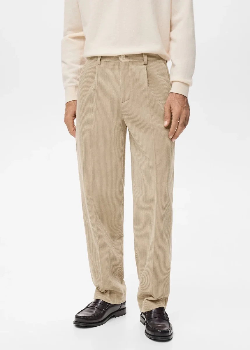 Vestibilità regolare. Tessuto 100% cotone. Tessuto in velluto a coste. Dettaglio piega frontale. Due tasche laterali. Due tasche a filetto con bottone sul retro. Chiusura con zip e bottone. Passanti per cintura