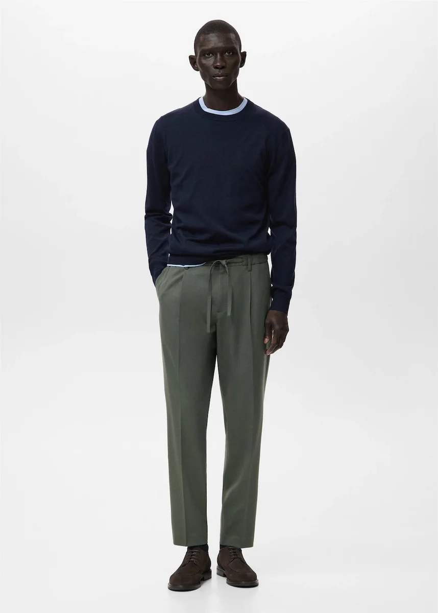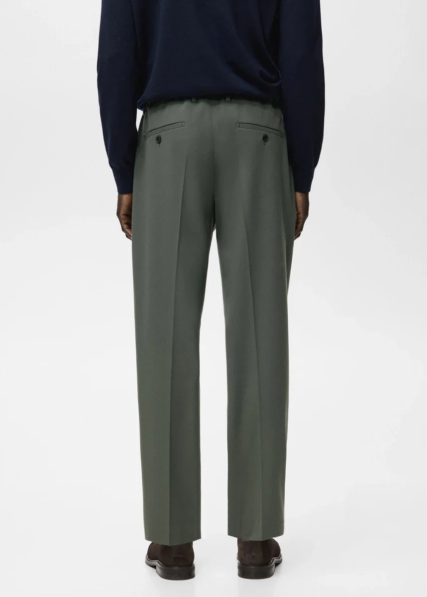 Vestibilità regolare. Tessuto in flanella. Dettagli di pinze anteriori e posteriori. Due tasche laterali. Due tasche a filetto con bottone sul retro. Elastico in vita con coulisse regolabile. Chiusura con zip e bottone. Passanti per cintura.
