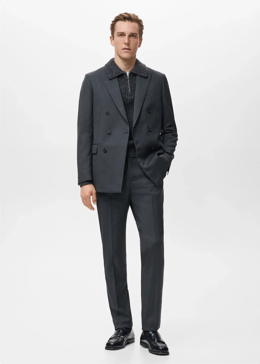 Vestibilità slim. 100% lana vergine. Tessuto 100% lana vergine. Dettaglio a righe stirate. Due tasche laterali. Tasca portamonete. Due tasche a filetto sul retro. Passanti per cintura. Chiusura frontale con cerniera, gancio e doppio bottone.