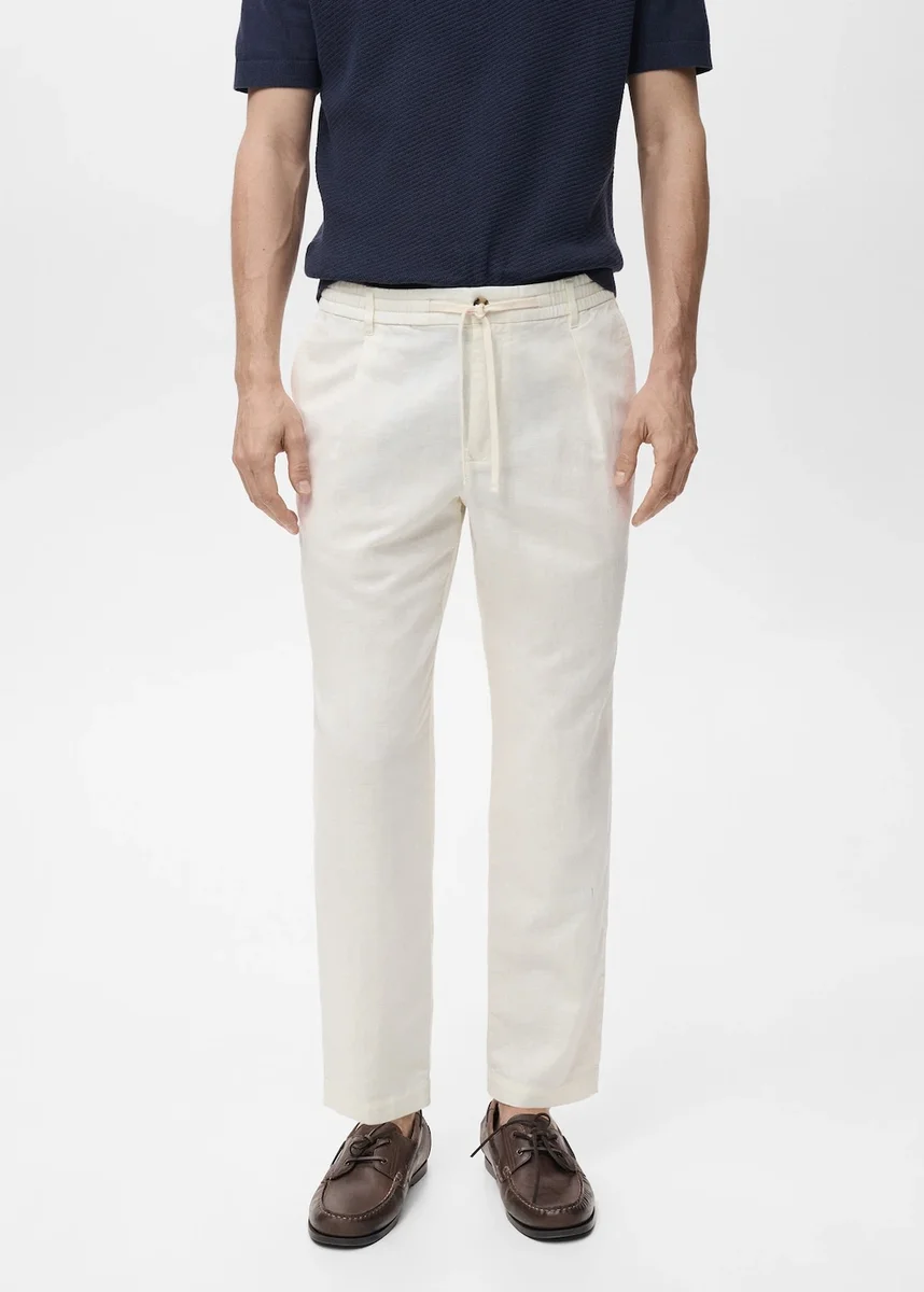 Tessuto misto cotone e lino. Silhouette slim. Elastico in vita con coulisse regolabile. Cordino con nodo visibile o nascosto all’interno. Passanti per cintura. Chiusura frontale con bottoni doppiopetto e cerniera. Pinces sul davanti. Due tasche anteriori. Due tasche a filetto con bottone sul retro. Tessuto misto lino. Vestibilità slim.