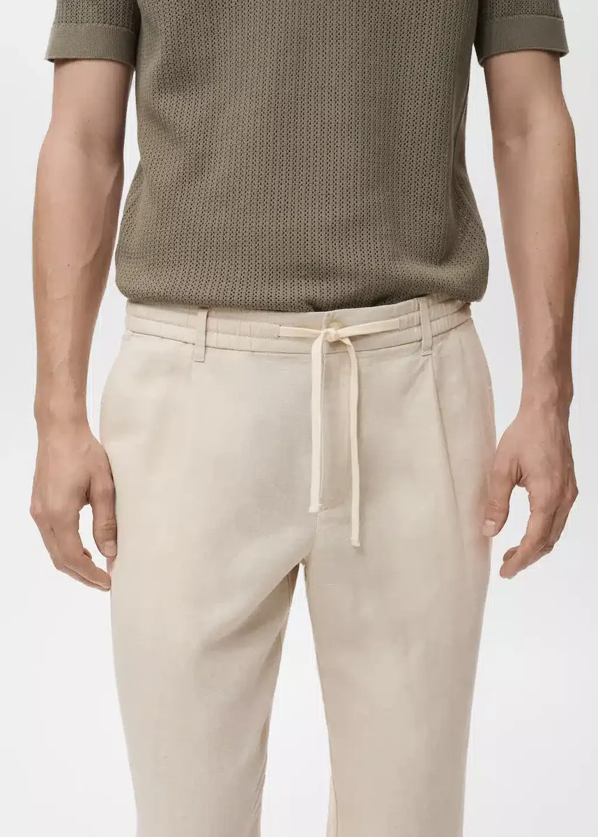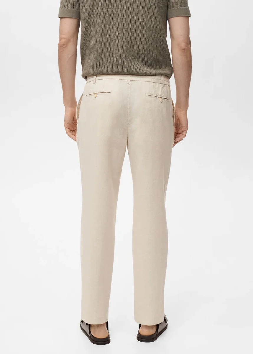 Tessuto misto cotone e lino. Silhouette slim. Elastico in vita con coulisse regolabile. Cordino con nodo visibile o nascosto all’interno. Passanti per cintura. Chiusura frontale con bottoni doppiopetto e cerniera. Pinces sul davanti. Due tasche frontali. Due tasche a filetto con bottone sul retro. Tessuto misto lino. Vestibilità slim. Black Friday.