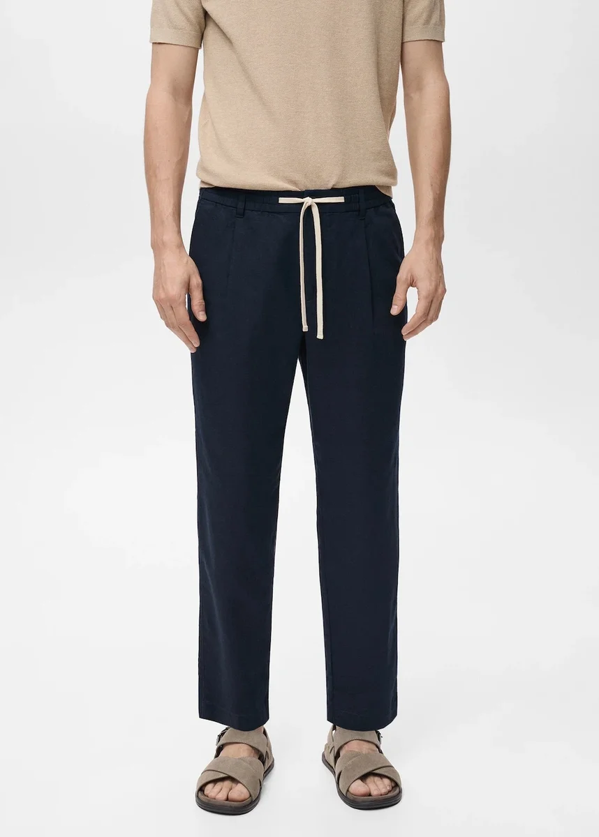 Tessuto misto cotone e lino. Silhouette slim. Elastico in vita con coulisse regolabile. Cordino con nodo visibile o nascosto all’interno. Passanti per cintura. Chiusura frontale con bottoni doppiopetto e cerniera. Pinces sul davanti. Due tasche anteriori. Due tasche a filetto con bottone sul retro. Tessuto misto lino. Vestibilità slim.