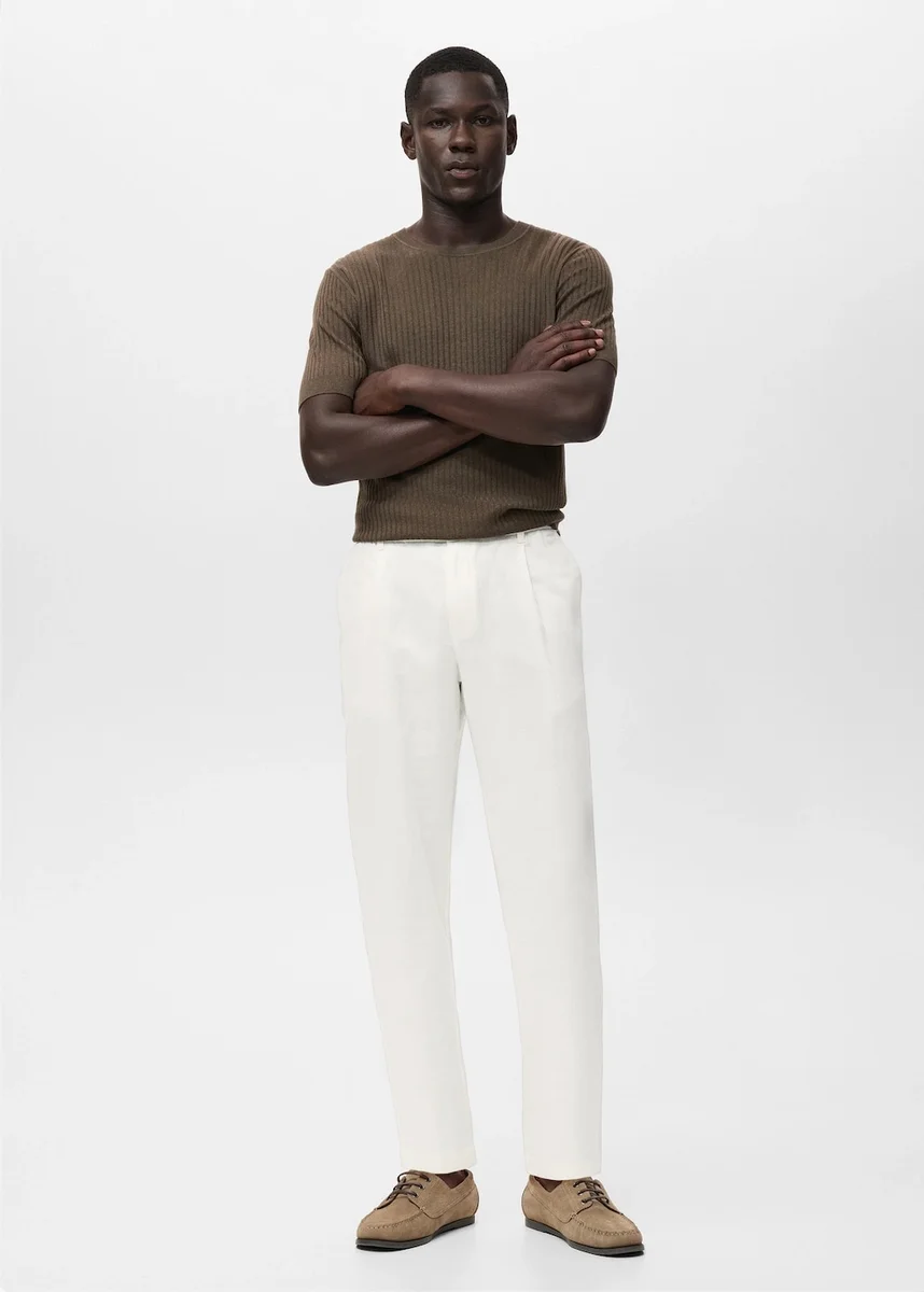Vestibilità slim. Tessuto misto cotone e lino. Elastico in vita con coulisse regolabile. Dettaglio piega frontale. Due tasche frontali. Due tasche a filetto sul retro. Passanti per cintura. Chiusura frontale con bottoni doppiopetto e cerniera.