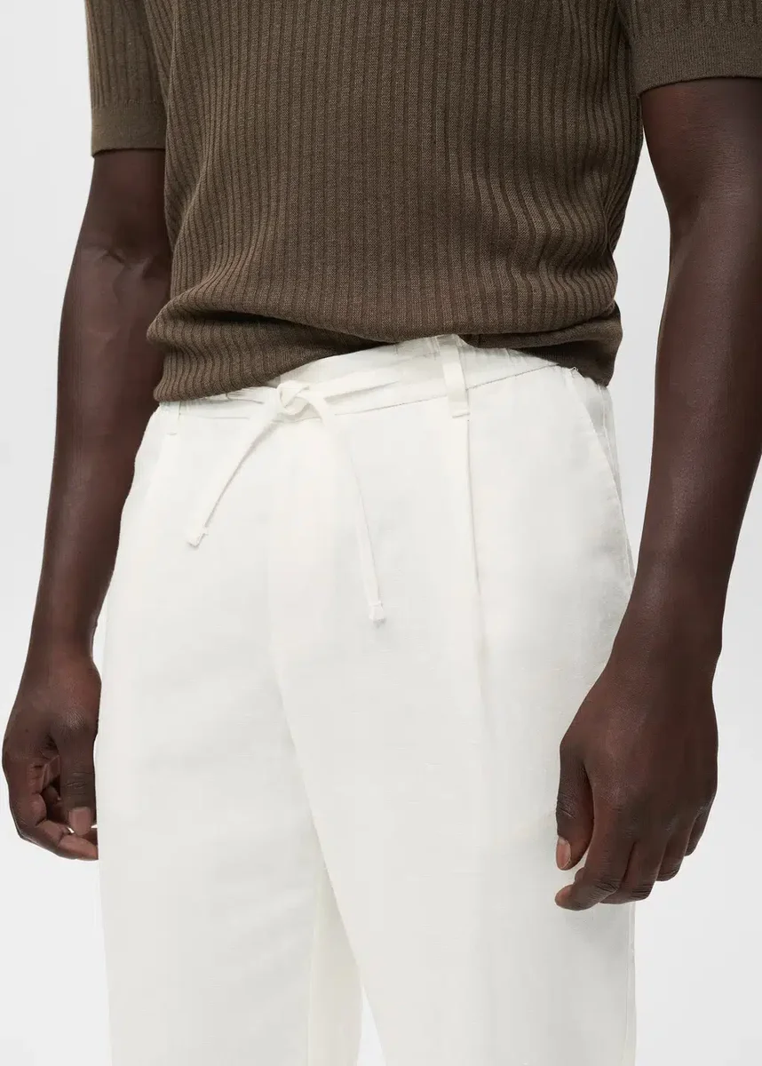 Vestibilità slim. Tessuto misto cotone e lino. Elastico in vita con coulisse regolabile. Dettaglio piega frontale. Due tasche frontali. Due tasche posteriori a filetto. Passanti per cintura. Chiusura frontale con bottoni doppiopetto e zip.