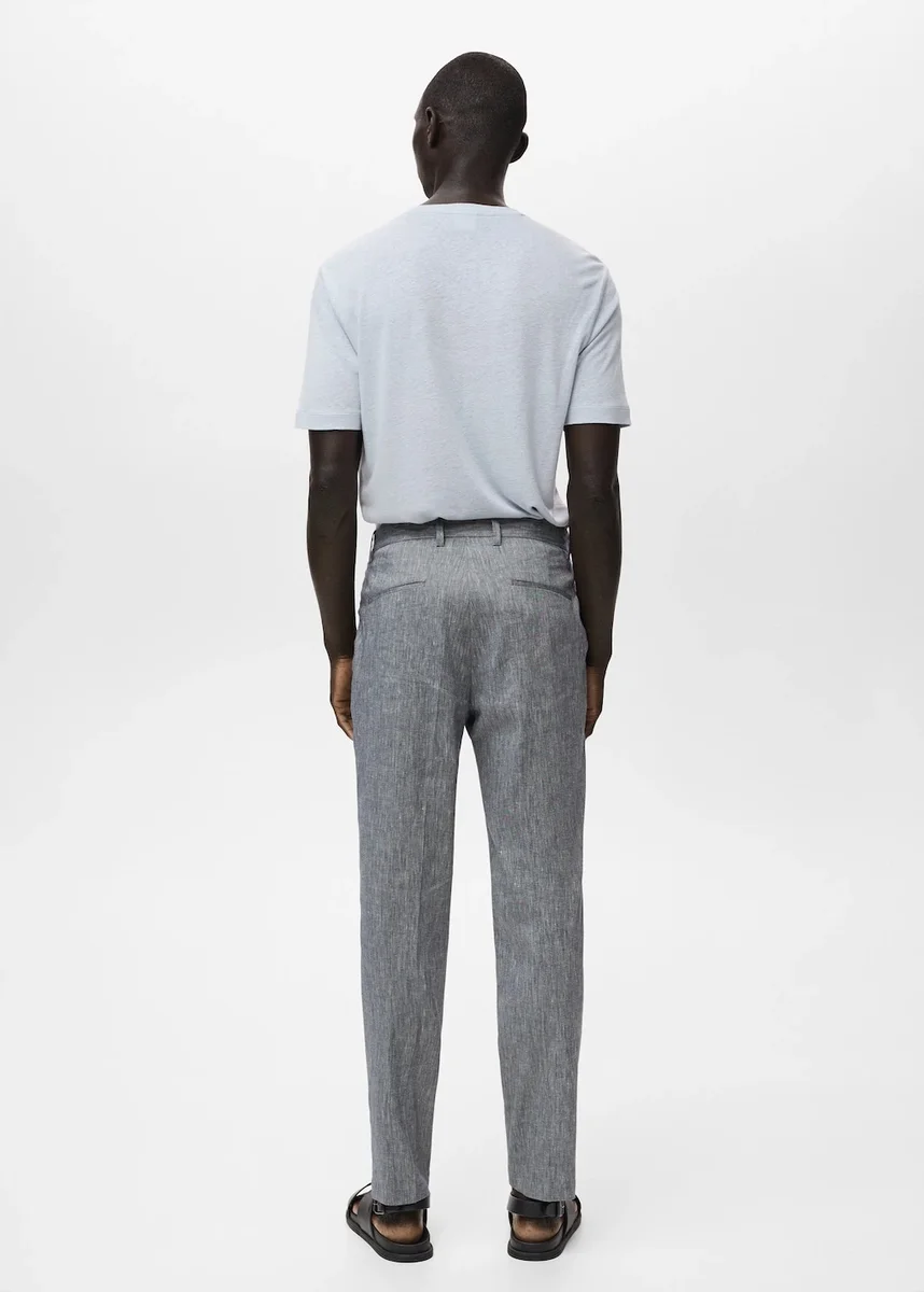 Vestibilità slim. 100% lino. Due tasche laterali. Due tasche a filetto con bottone sul retro. Passanti per cintura. Chiusura con zip e bottone