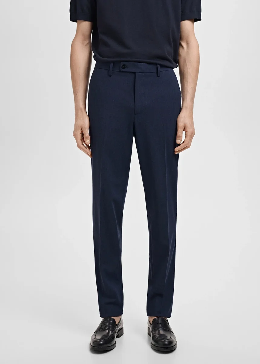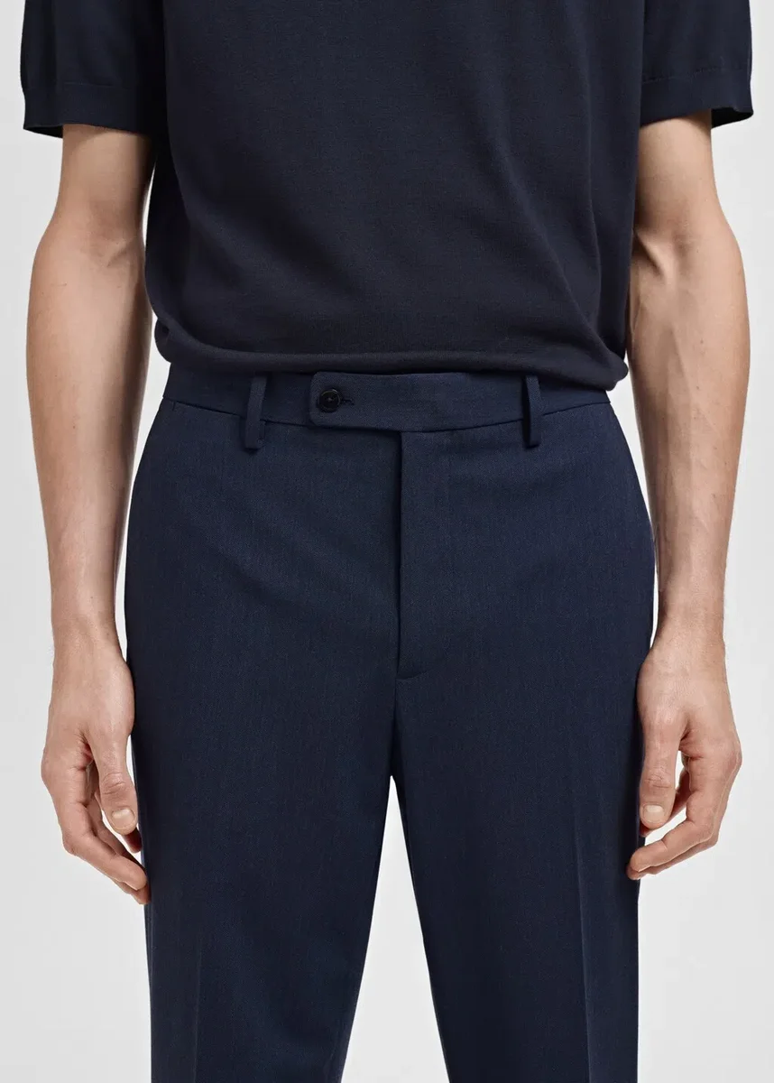 Vestibilità slim. Collezione sartoriale. Passanti per cintura. Chiusura frontale con bottoni doppiopetto e cerniera. Due tasche laterali. Due tasche a filetto con bottone sul retro. Dettaglio a strisce stirate sul davanti e sul retro