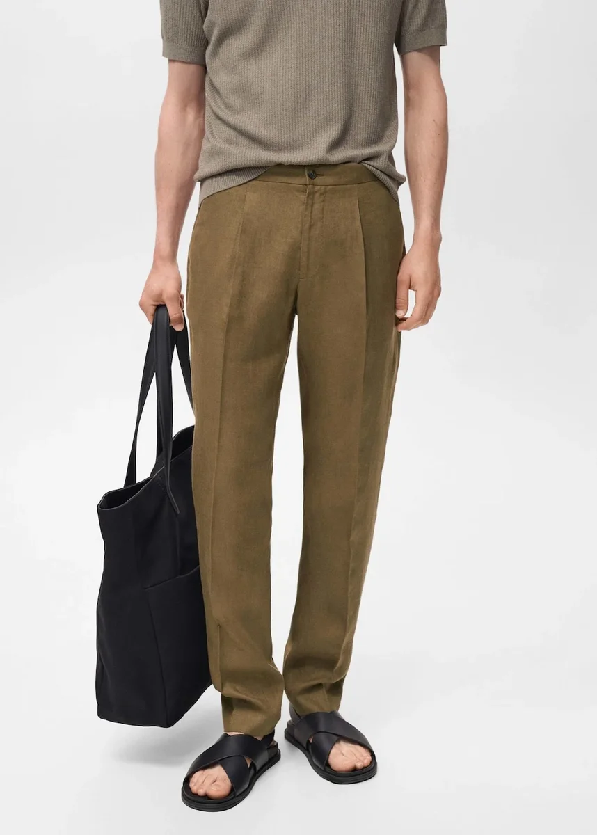 Vestibilità slim. Tessuto 100% lino. Collezione sartoriale. Elastico in vita sul retro. Chiusura con bottone e cerniera. Due tasche laterali. Dettaglio piega frontale. Due tasche a filetto con bottone sul retro
