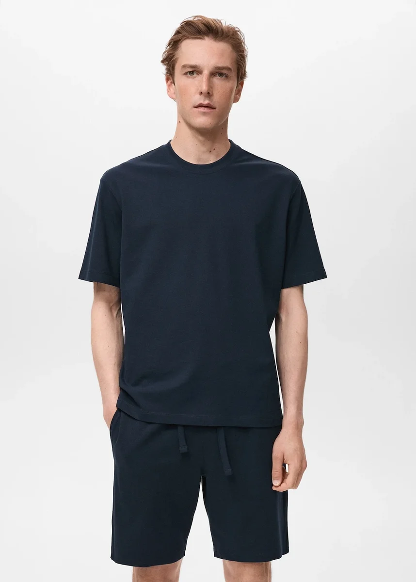 Tessuto misto cotone. T-shirt. Bermuda con elastico in vita. Couple in vita. Include una borsa per riporre i capi.