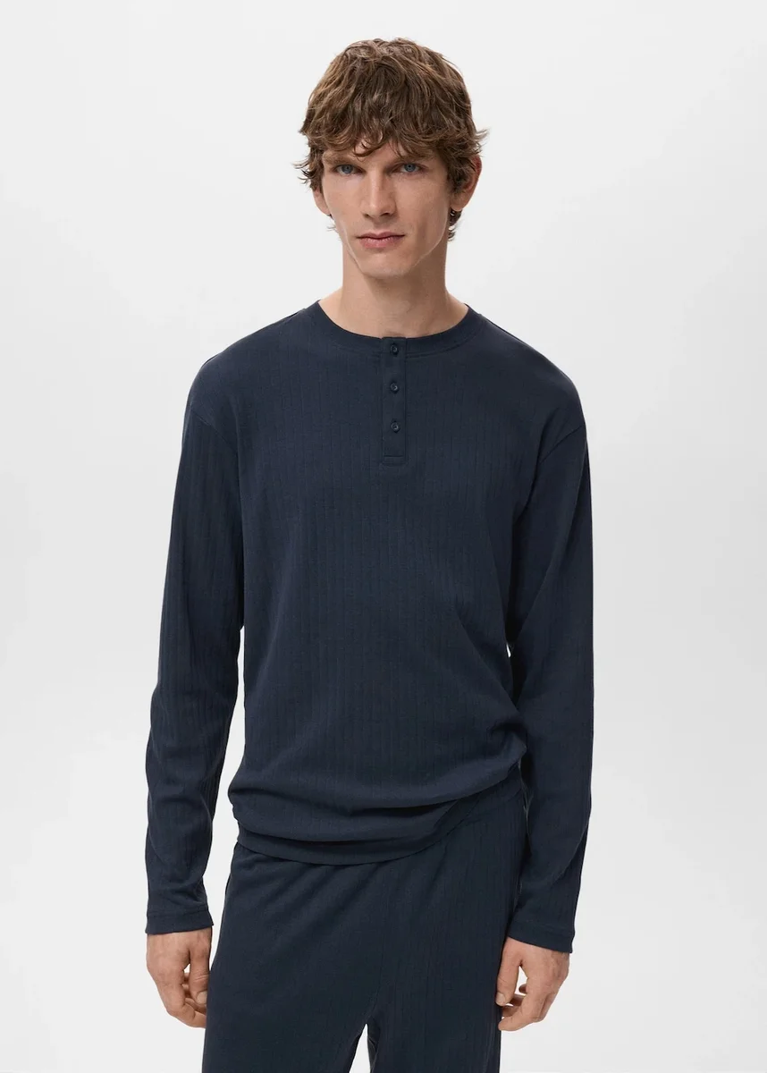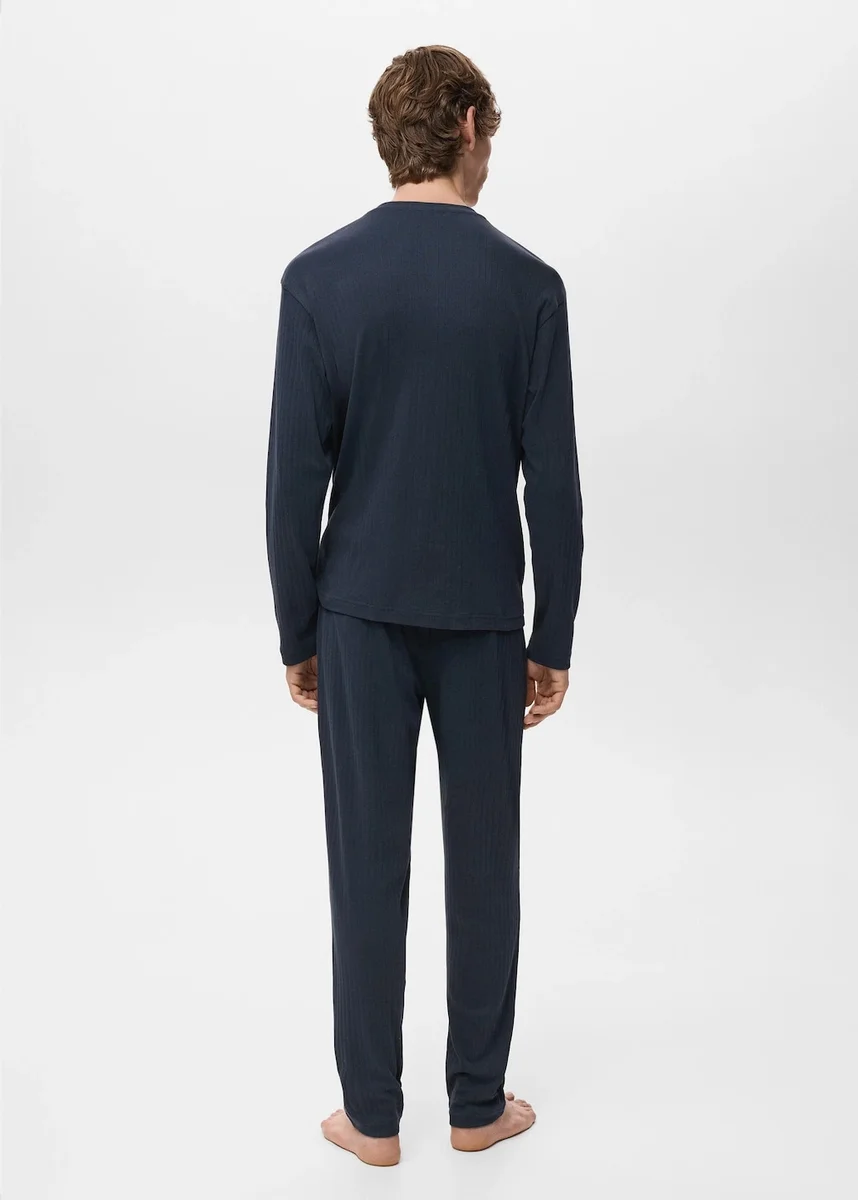 Tessuto 100% cotone. Maglietta a maniche lunghe e pantaloni lunghi con elastico in vita e coulisse regolabile. Include una borsa per riporre i capi.
