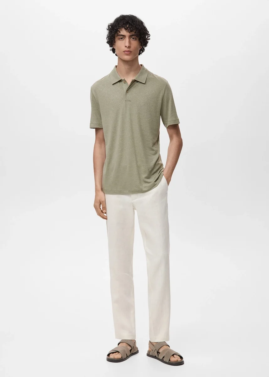 Silhouette slim. Tessuto misto lino. Collo polo con chiusura a bottoni. Maniche corte. Piccoli spacchi laterali sull’orlo. Orlo dritto. Vestibilità slim. Prodotto promozionale.