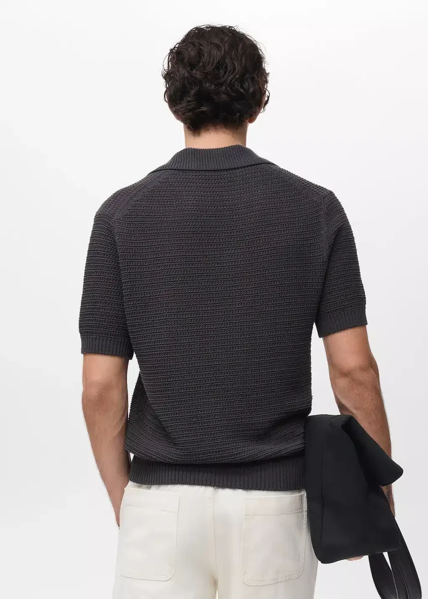 Tessuto in cotone. Design dritto. Tessuto a maglia grossa. Collo polo a V senza chiusura. Maniche corte. Collo, maniche e orlo a costine.