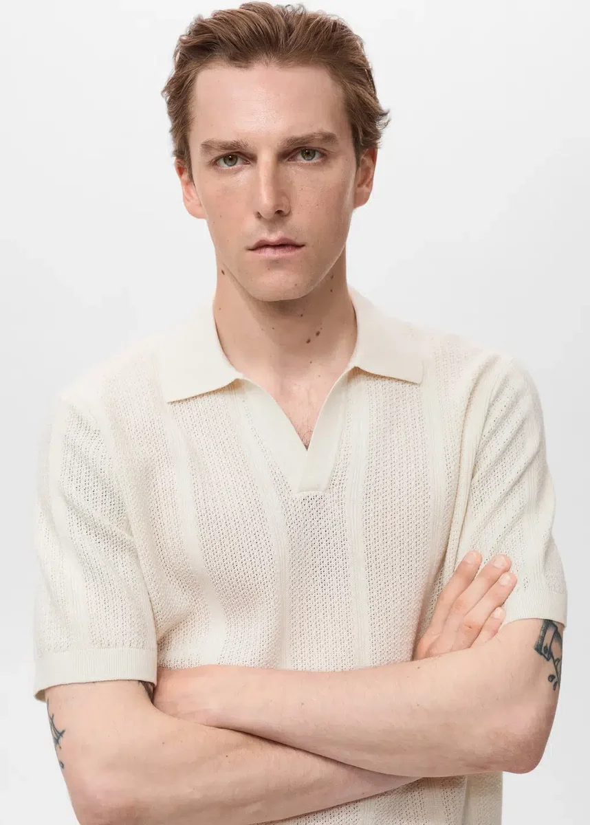 Silhouette dritta. Tessuto misto cotone. Maglia traforata. Design a righe. Polo con colletto senza bottoni. Maniche corte. Colletto, maniche e orlo a costine. Black Friday
