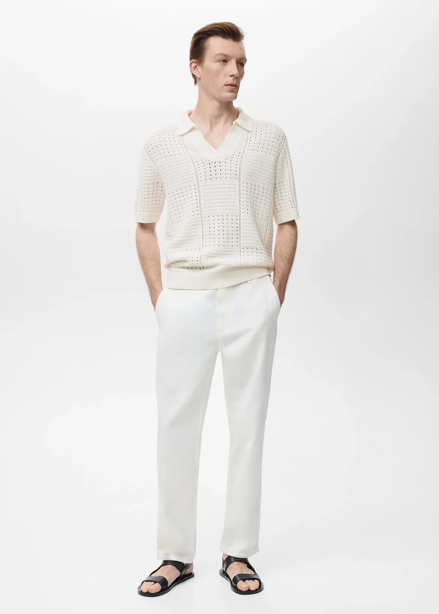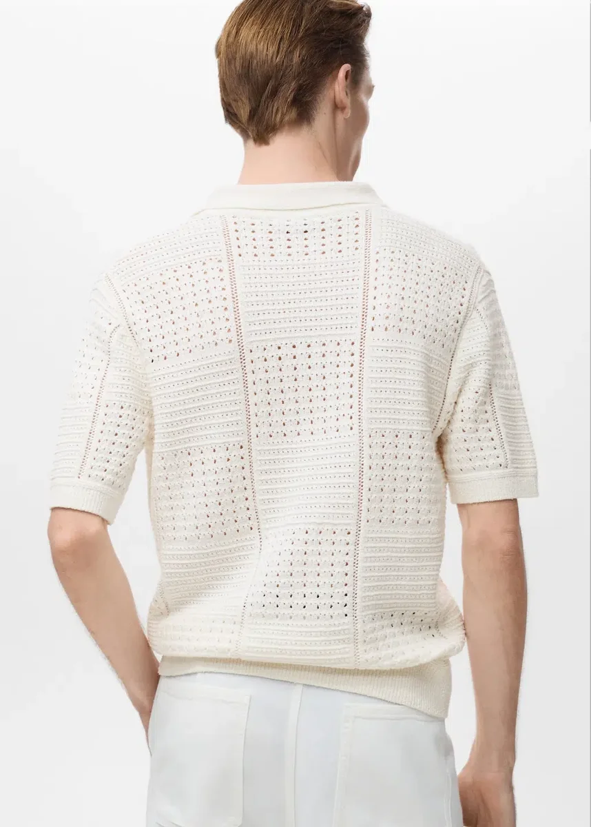 Tessuto misto cotone. Maglia traforata. Design dritto. Maniche corte. Polo con colletto senza bottoni. Colletto, maniche e orlo a costine.