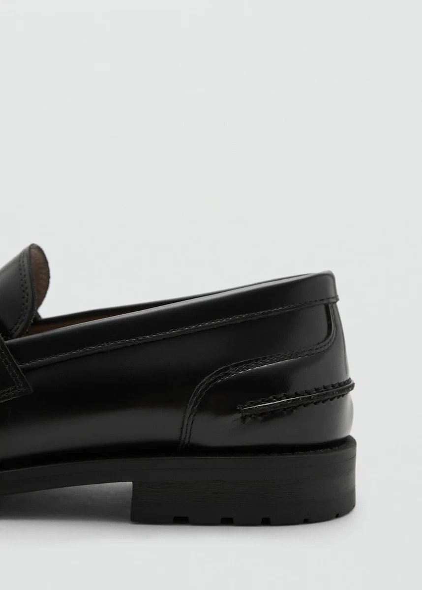 Pelle bovina. Dettaglio maschera sulla tomaia. Punta arrotondata. Dettagli cuciti sul retro. Dettaglio posteriore.