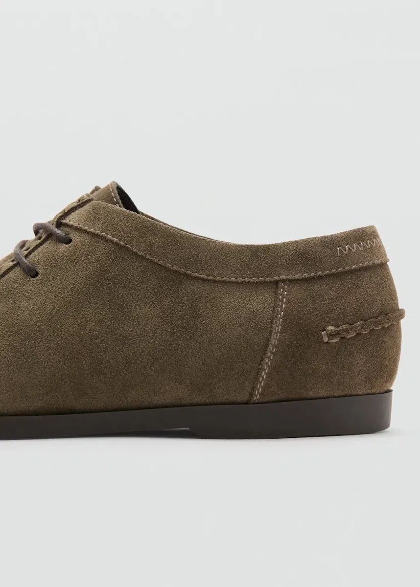 Pelle bovina. Finitura scamosciata. Allacciatura con due posizioni. Dettagli cuciti sul retro. Suola in gomma a contrasto. Punta arrotondata