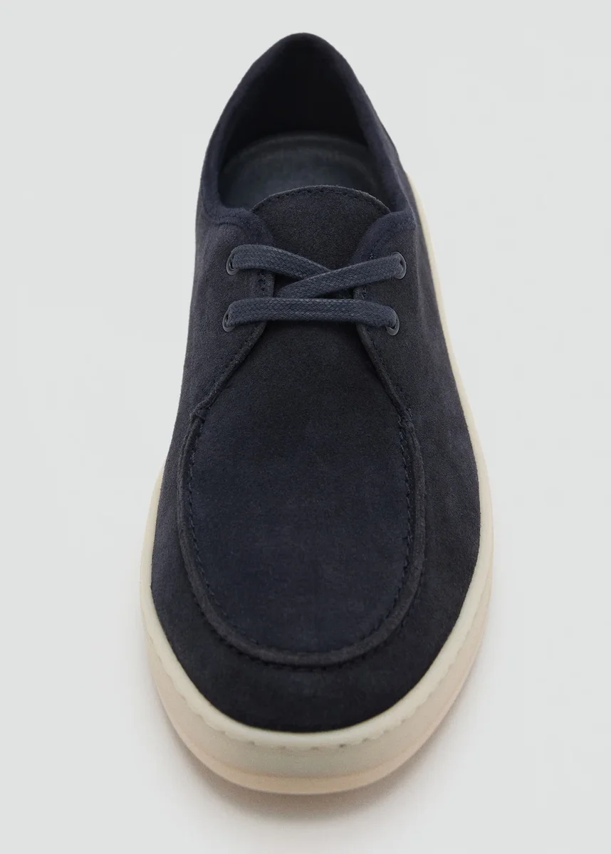 100% pelle bovina. Finitura scamosciata. Chiusura con lacci a due posizioni. Dettagli cuciti a punto indietro. Punta arrotondata. Suola in gomma a contrasto