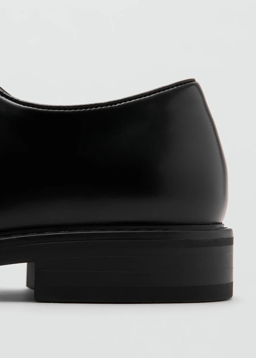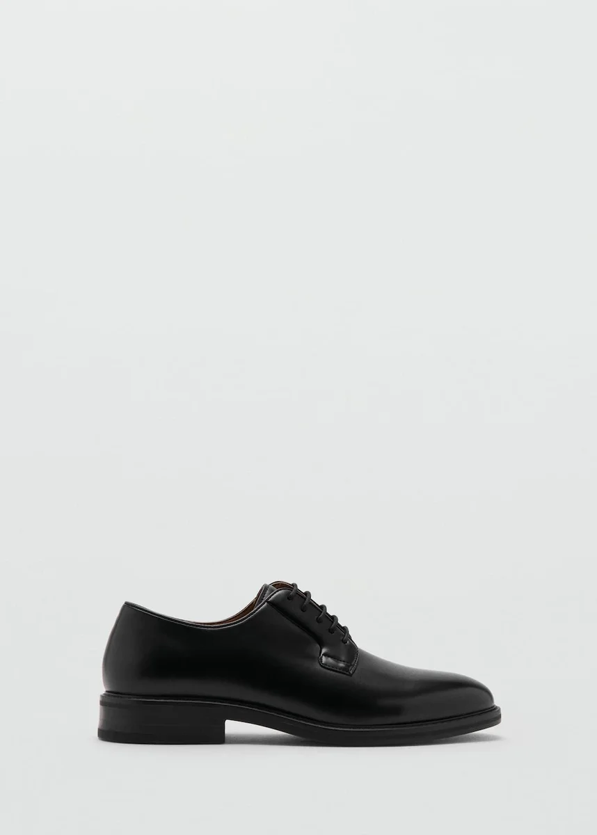 Similpelle nappa. Modello blucher dal taglio classico. Chiusura con lacci a cinque passanti. Dettagli con cuciture a punto indietro. Punta arrotondata. Suola in tinta.