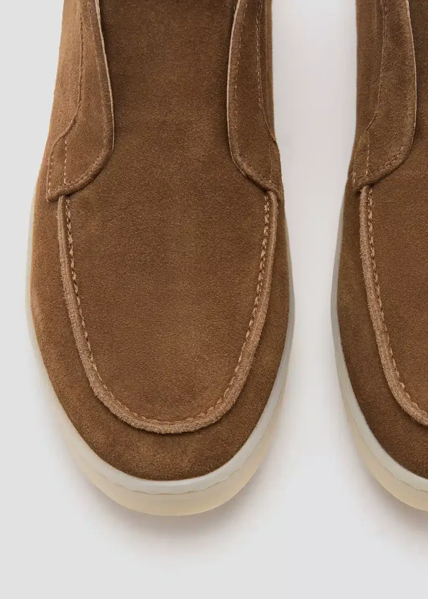 100% pelle scamosciata. Suola in gomma. Dettagli cuciti a punto indietro. Punta arrotondata. Senza lacci.