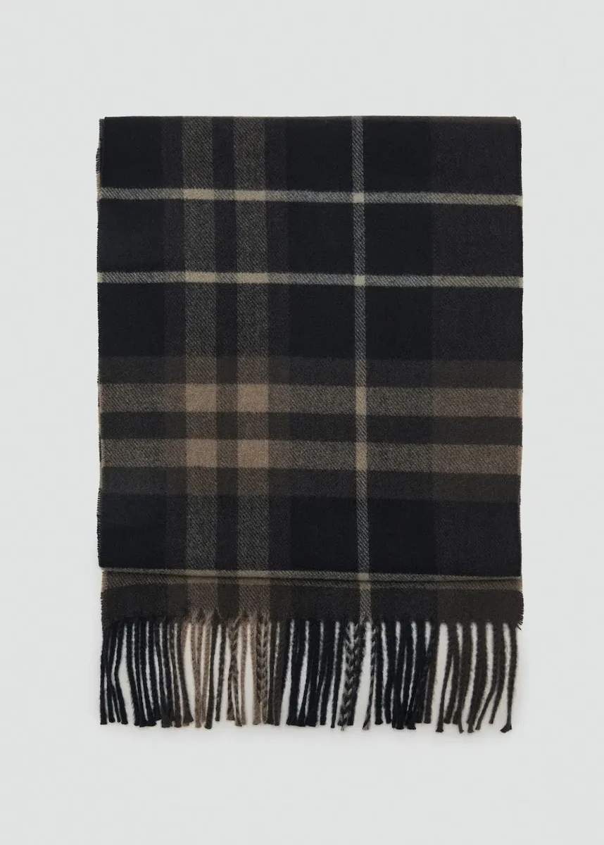 Tessuto misto viscosa. Motivo a quadri. Finitura con frange.